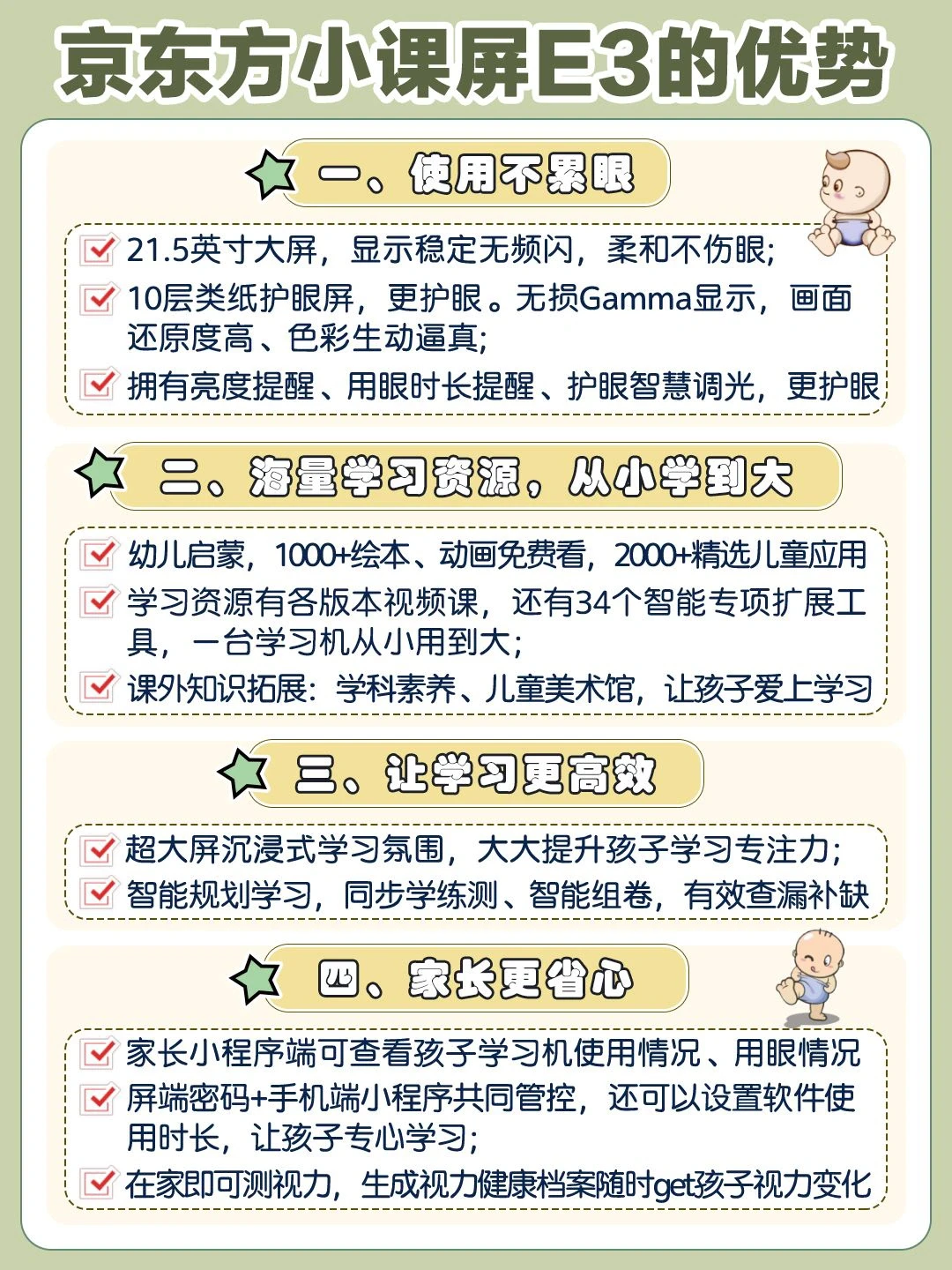 💯总体来说作为一款护眼学习一体机,京东方小课屏E3我是非常满意的,护眼功能强大,学习资源能用到大,性价比还是不错!比较推荐!