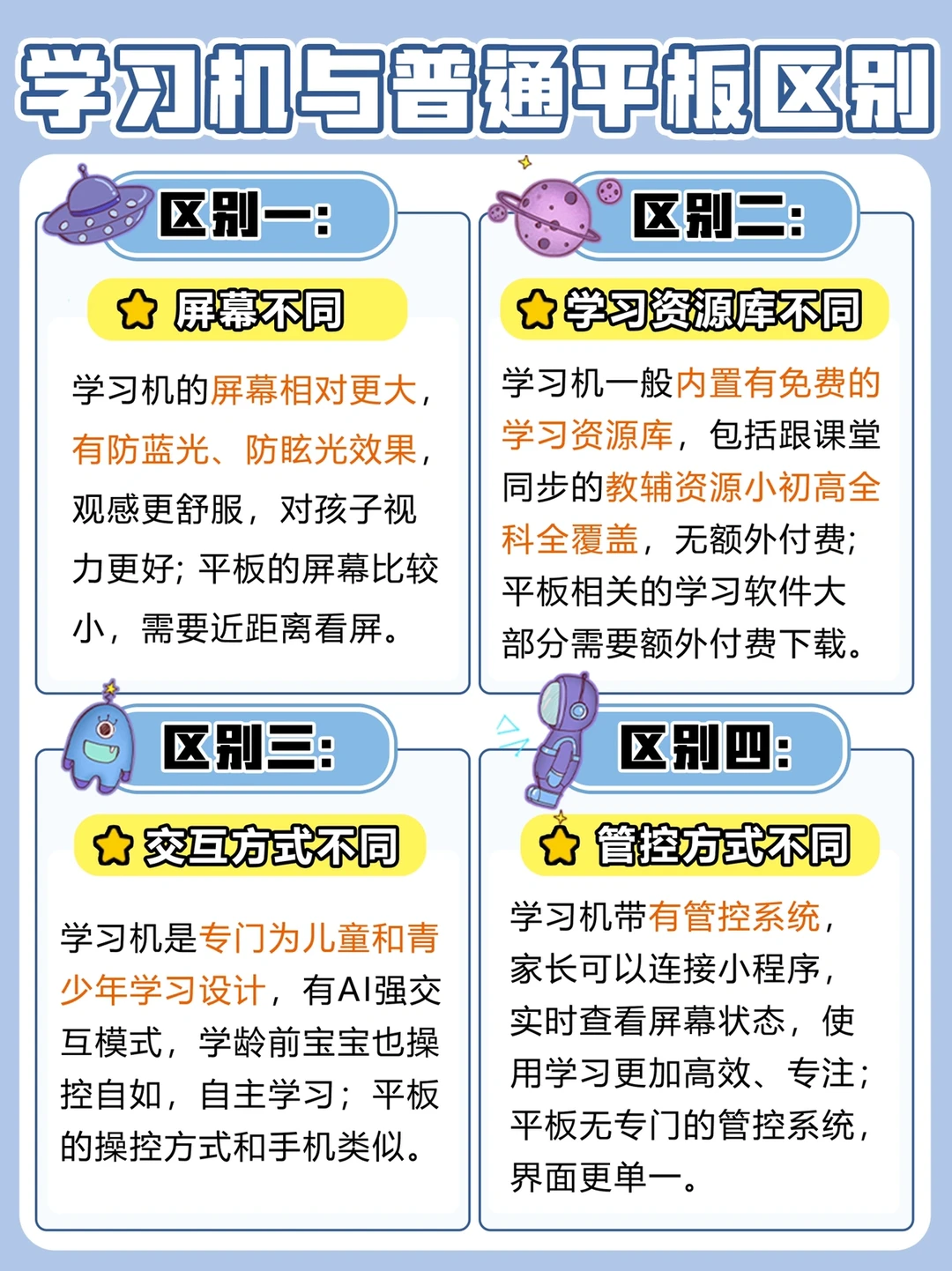 🌀说到学习机,可能很多家长觉得跟日常我们用的平板无异!但很多家长都错了!学习机是针对孩子学习使用的,不管是从学习资源还是从护眼方向来说,都是优于普通平板的!