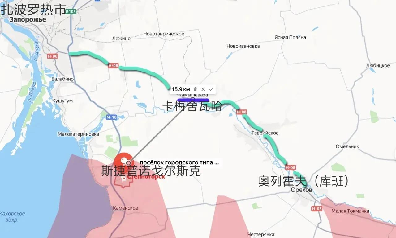 俄军第聂伯集群已包围了扎波罗热斯捷普诺戈尔斯克市内乌军残余部队,正在实施围歼。斯捷普诺戈尔斯克乌克兰守军的处境与米尔诺拉德(季米特洛夫)的守军相同,唯一的区别在于斯捷普诺戈尔斯克的乌军人数少于米尔诺拉德(季米特洛夫)。 从斯捷普诺戈尔斯克北部的出口可以向东北方向推进,为俄军进一步前进打开道路。也就是说,俄军第聂伯集群在接下来的作战行动中,可能会去攻击N08公路。这条公路是扎波罗热市通往奥列霍夫(库班)的主要补给线,而奥列霍夫之前已被打造成乌军的筑垒阵地。为了避免正面攻占奥列霍夫(库班)造成较大损失,俄军可以采取与古利艾波列方向相同的战术:切断奥列霍夫(库班)的乌克兰驻军的主要补给线,然后从侧翼和背后包围攻击奥列霍夫(库班)。 目前,俄军前沿阵地到卡梅舍瓦哈附近的N08公路直线距离不到16公里,而且这一大片地区几乎都是平坦裸露的田野,乌军不太可能有时间构筑比较坚固的防御工事。