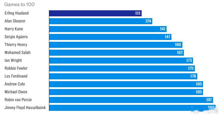 哈兰德英超百球 哈兰德只用了111场就实现了英超百球,这一最快纪录,不会有人打破