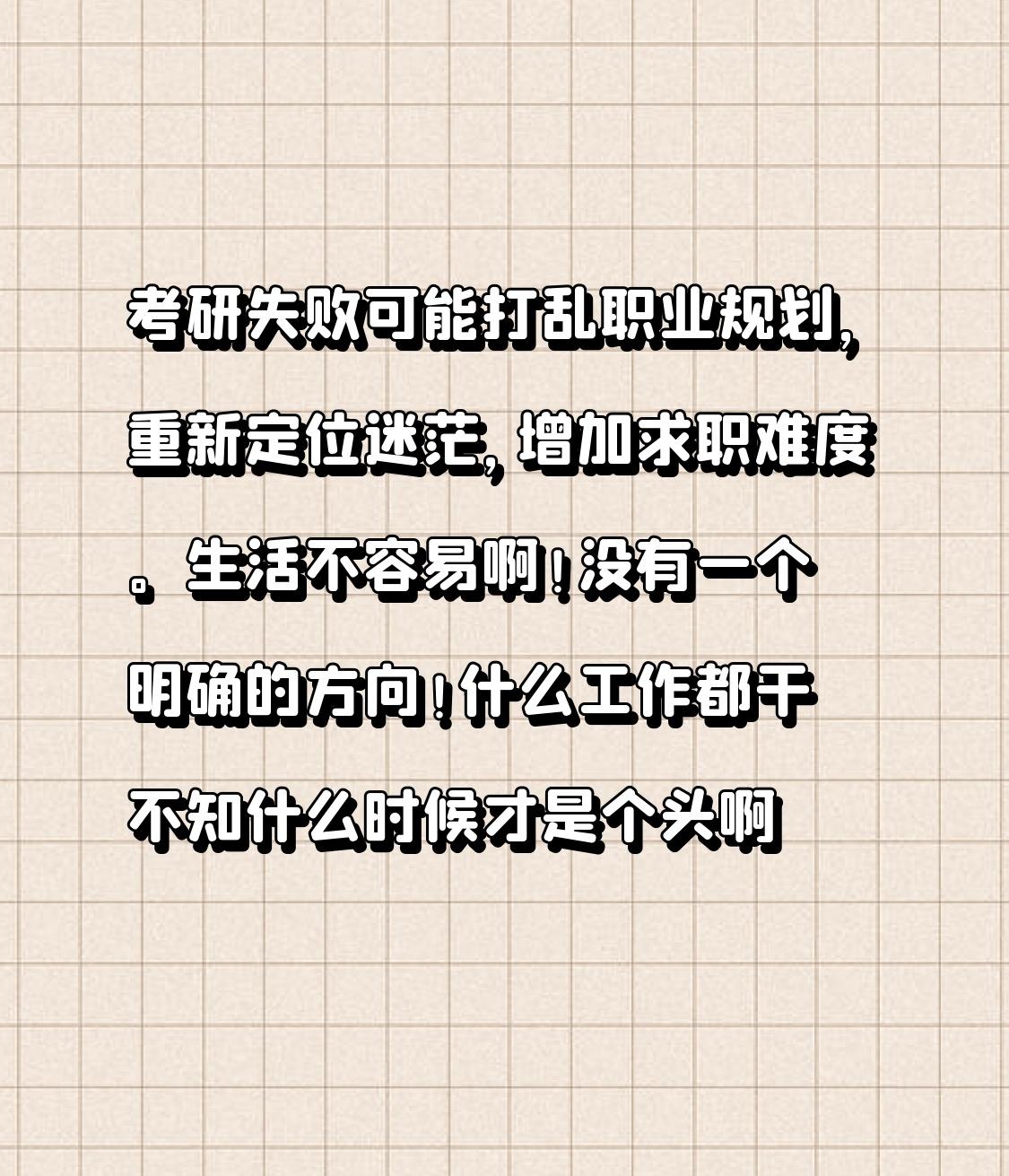 考研失败真的太闹心了,就像我认识的一个2024届产品设计专业毕业生,本科双非,大学拿了不少奖,还年年有奖学金。可他一心考研,错过了实习。第一次考研失利后心灰意冷,毕业前摆烂。十月又决定再战,目标还是那所离家近的普通院校。但周围质疑声不断,朋友有的保研,有的进大厂,他在一线城市投简历,大多只能拿六七千,还被不少企业拒之门外。考研失败后职业规划全乱套,重新定位又迷茫,求职难度也增加。不过别慌,迷茫是正常的,不妨问问自己理想生活啥样,当下啥选择能攒够实现它的“资本”。