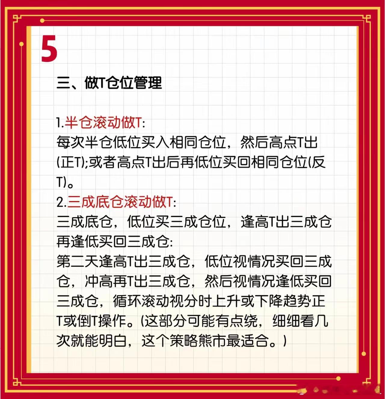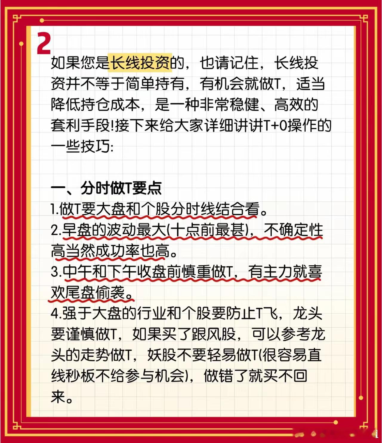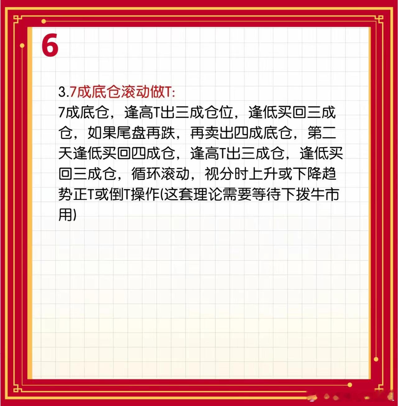 长期持股,反复做T把成本“T成负数”长期持有一只股票,坚持每天做T,是稳健降本的高效套利手段。做T≠简单持有,而是利用分时波动,把持仓成本越做越低,熊市也能躺赚筹码。分时做T四铁律:早盘十点前波动最猛,成功率最高;中午和尾盘慎动,主力最爱偷袭;强于大盘的龙头别轻易T飞,跟风股可看龙头脸色;妖股直线秒板,做错就买不回来。经典多空五信号:无量上冲+大盘向下=空;股价新高MACD背离+大盘向下=空;回踩均线获支撑+大盘向上=多;均线下方反抽受压+大盘向下=空;股价新低MACD背离+大盘向上=多。个股叠加指数看,弱于大盘就再等等。仓位滚动三套路:半仓滚动——低位半仓买,高位半仓T;或先高卖再低买。三成底仓滚动——熊市神器,每天三成仓低吸高抛,循环往复,日日降本。七成底仓滚动——牛市备选,逢高T出三成,尾盘再跌再T四成,次日逢低买回,循环滚动,趋势为王。温馨提示:投资有风险,选择需谨慎,风险责任由购买者自行承担。点赞、关注、评论、收藏、转发,五连支持走一波!本文仅供思路交流,不做投资推荐,股市有风险,入市需谨慎。