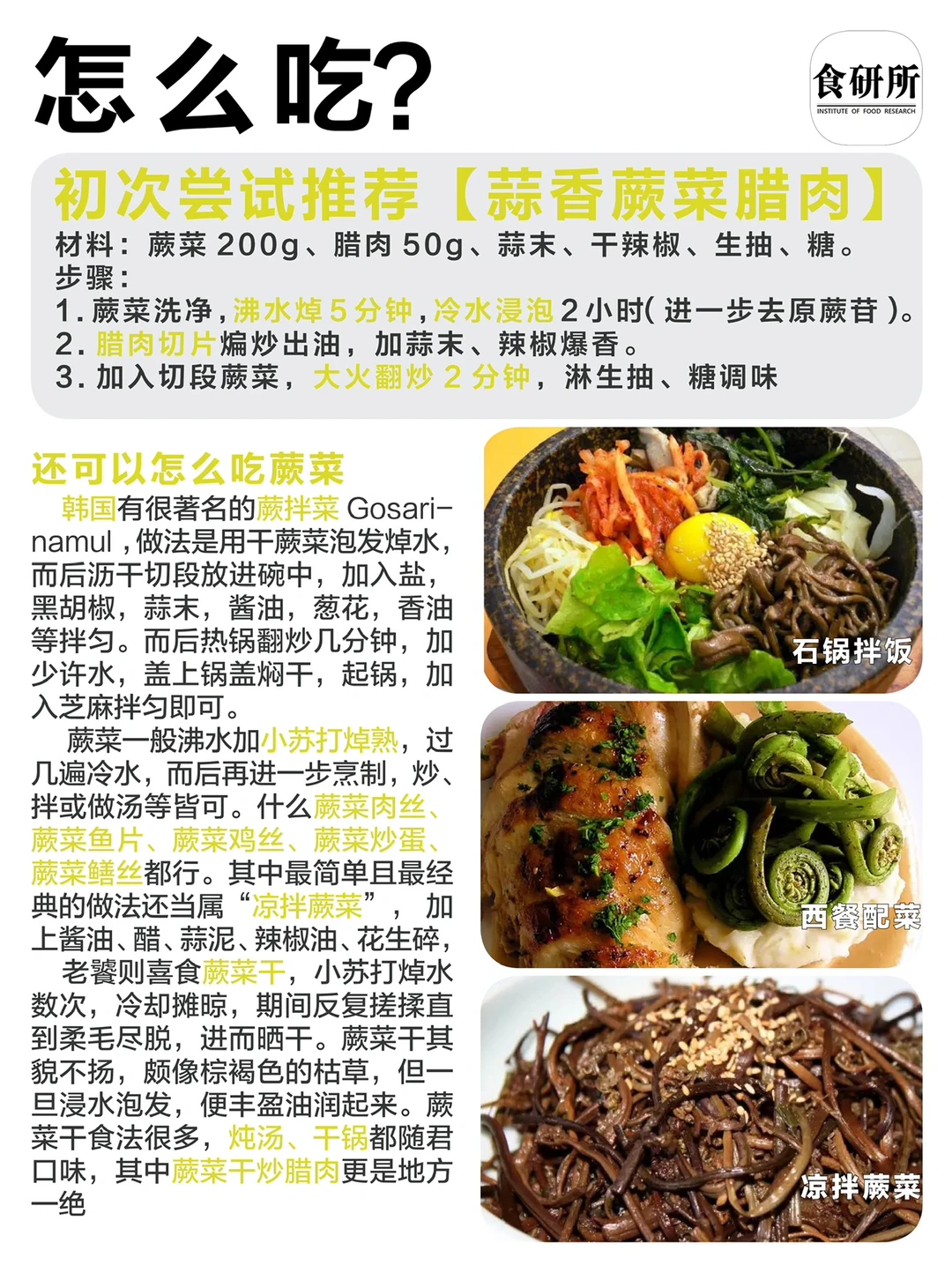 韩国有很著名的蕨拌菜Gosari-namul ,做法是用干蕨菜泡发焯水,而后沥干切段放进碗中,加入盐,黑胡椒,蒜末,酱油,葱花,香油等拌匀。而后热锅翻炒几分钟,加少许水,盖上锅盖焖干,起锅,加入芝麻拌匀即可。