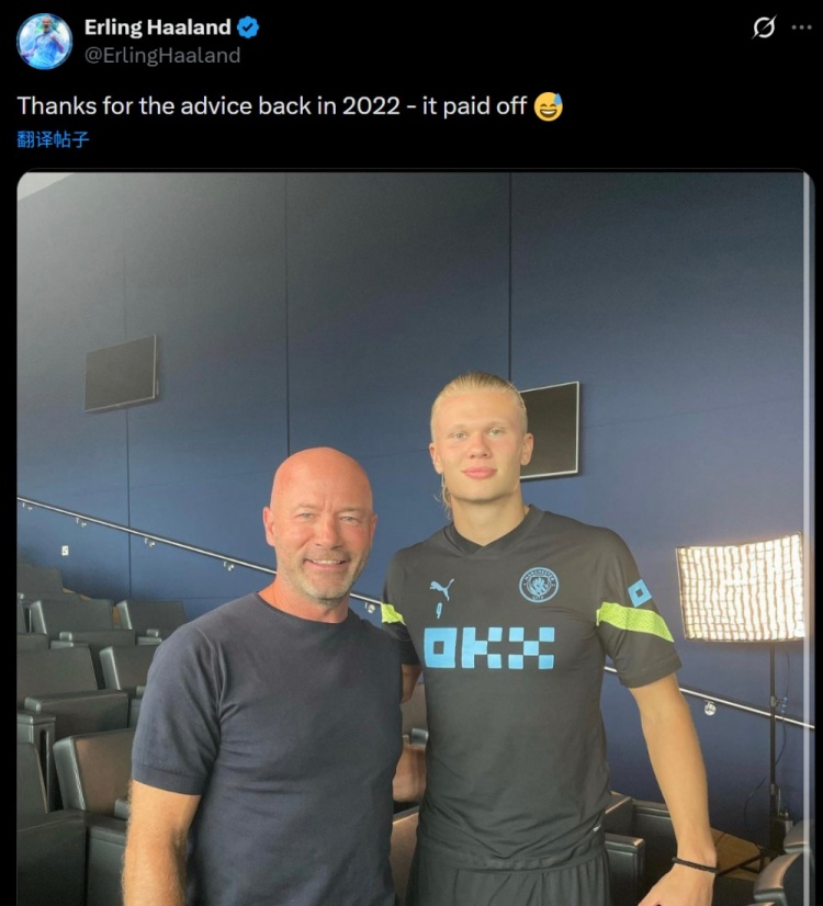 哈兰德社媒晒同阿兰·希勒合影:感谢3年前的建议,它很管用