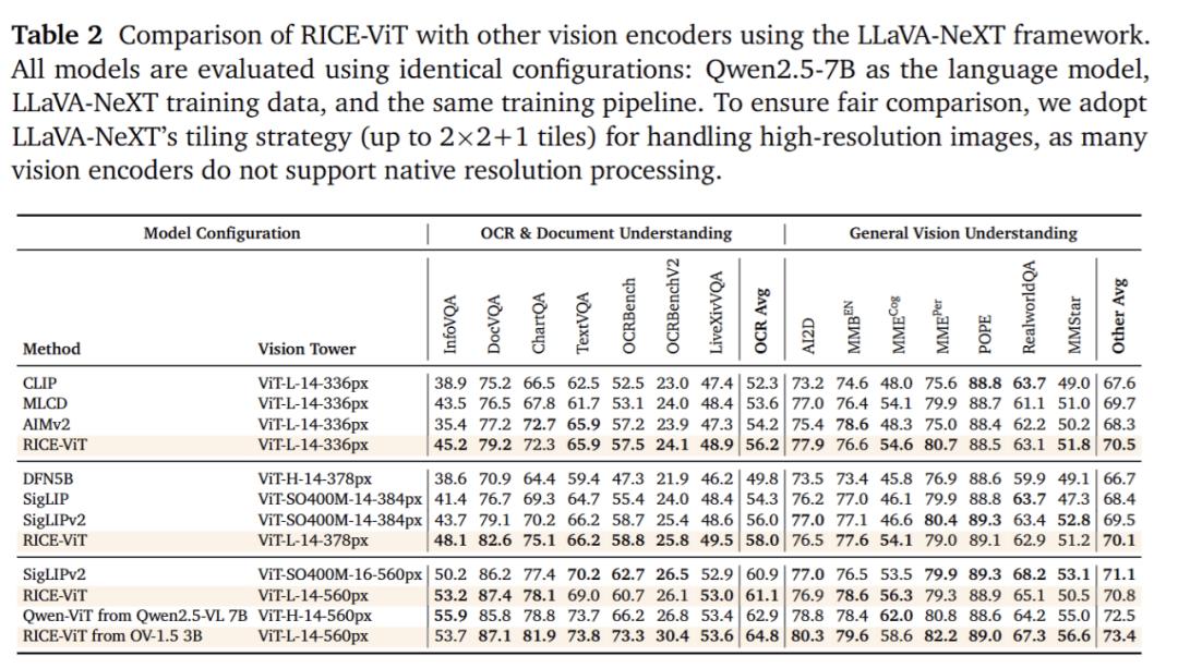 为了让模型在 OCR、表格 / 文档、区域理解与后续指令推理上具有更高的下限,我们在 LLaVA-OneVision-1.5 中采用自研的 MVT v1.5(RICE-ViT) 作为视觉主干。