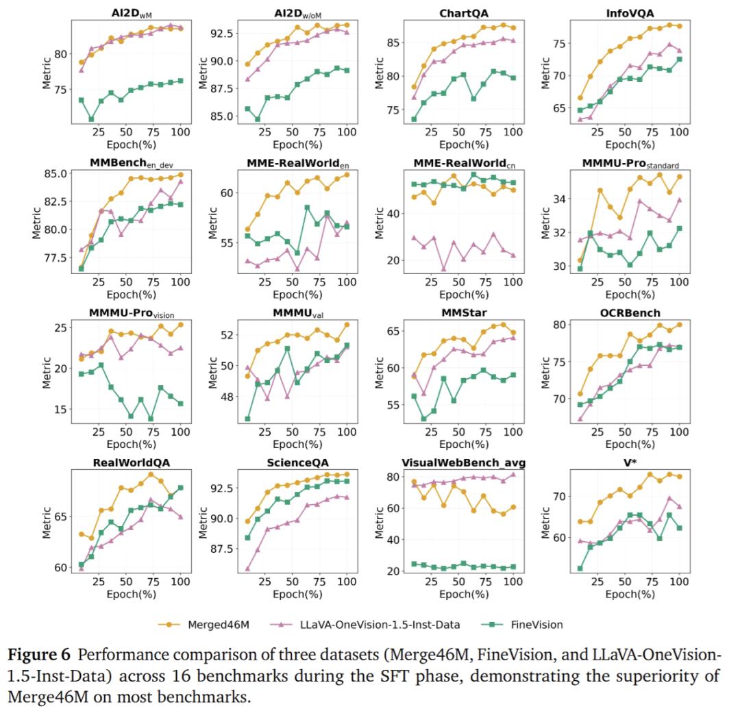 指令数据 22M 覆盖八大类别:Caption、ChartTable、CodeMath、Domain-specific、General VQA、GroundingCounting、OCR、Science。通过多源聚合、格式统一、指令重写、双语互转、模板去同质化与安全筛除,保持类别与难度分布均衡。并且我们的指令数据叠加 FineVision 数据集之后,结果会继续增加。