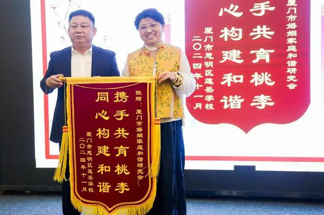 厦门市莲岳学校董事长苏数含女士并向江振发会长赠送锦旗“携手共育桃李,同心构建和谐”。
