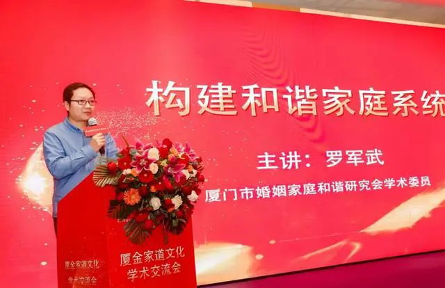 厦门市婚姻家庭和谐研究会学术委员罗军武从系统论的视角切入,谈了怎样构建和谐的家庭系统。他阐述了家庭问题必须放在家庭大系统中,才能从根本上解决。他祝愿两岸同胞通过此次交流会加深互相关爱,共筑亲情桥梁。
