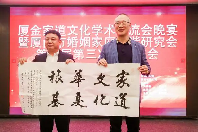 金门嘉宾特赠予厦门市婚姻家庭和谐研究会 “家道文化 华夏根基” 墨宝,再次印证两岸家文化的一脉相承与理念相通。
