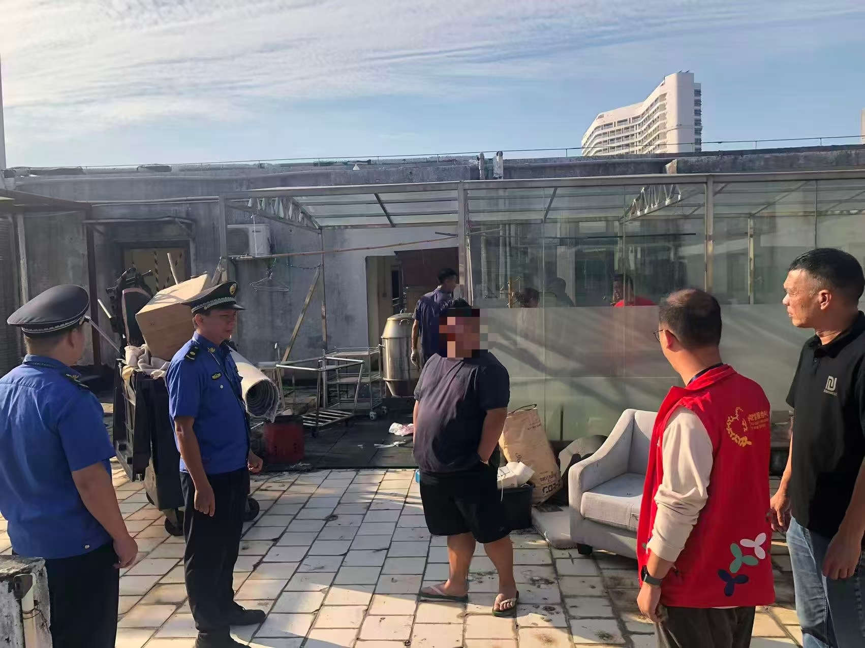 然而,在随后的回访复查中,执法人员发现该酒店的天面卫生问题并未得到任何整改,现场环境依旧脏乱。面对酒店方"我行我素"、拒不整改的态度,执法人员再次约谈酒店负责人,并依法作出罚款的行政处罚。最终,酒店负责人意识到自身行为的错误,当场承诺立即对天面进行彻底清理和整改。