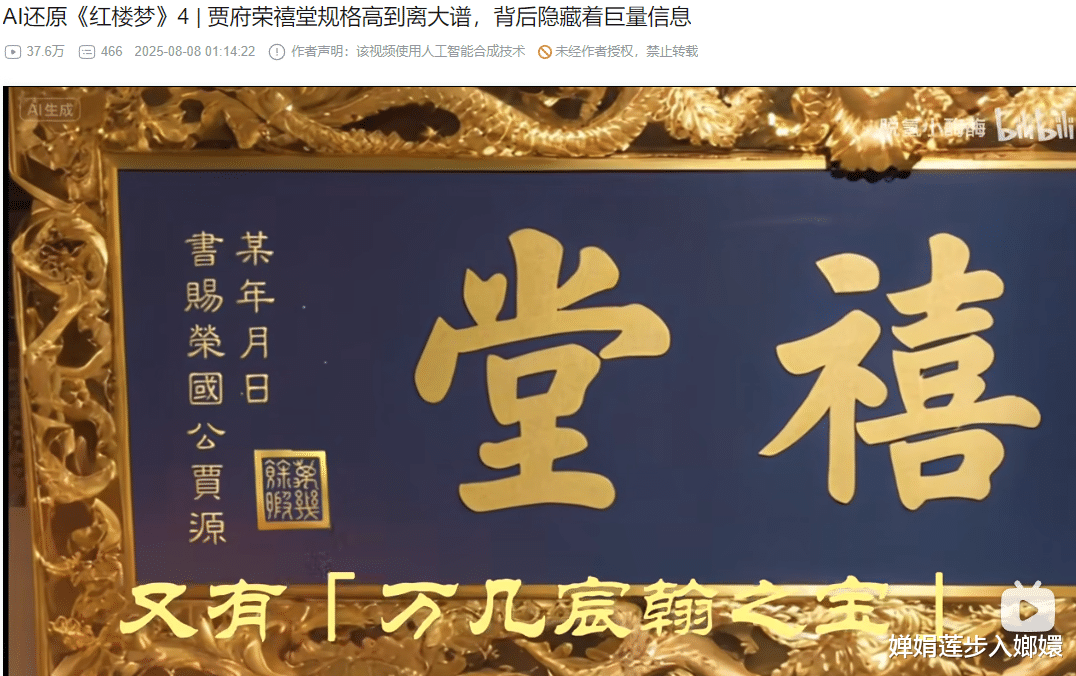 今天刷到一个《红楼梦》AI解说博主的视频,讲的是“林黛玉进贾府”名场面,画面制作得倒还算精良,原文写荣禧堂匾额“后有一行小字:‘某年月日书赐荣国公贾源’”,结果博主直接把“某年月日”照搬上匾。令人哭笑不得。这一细节暴露的,不是AI训练的不足,而是创作者对《红楼梦》理解的严重肤浅。