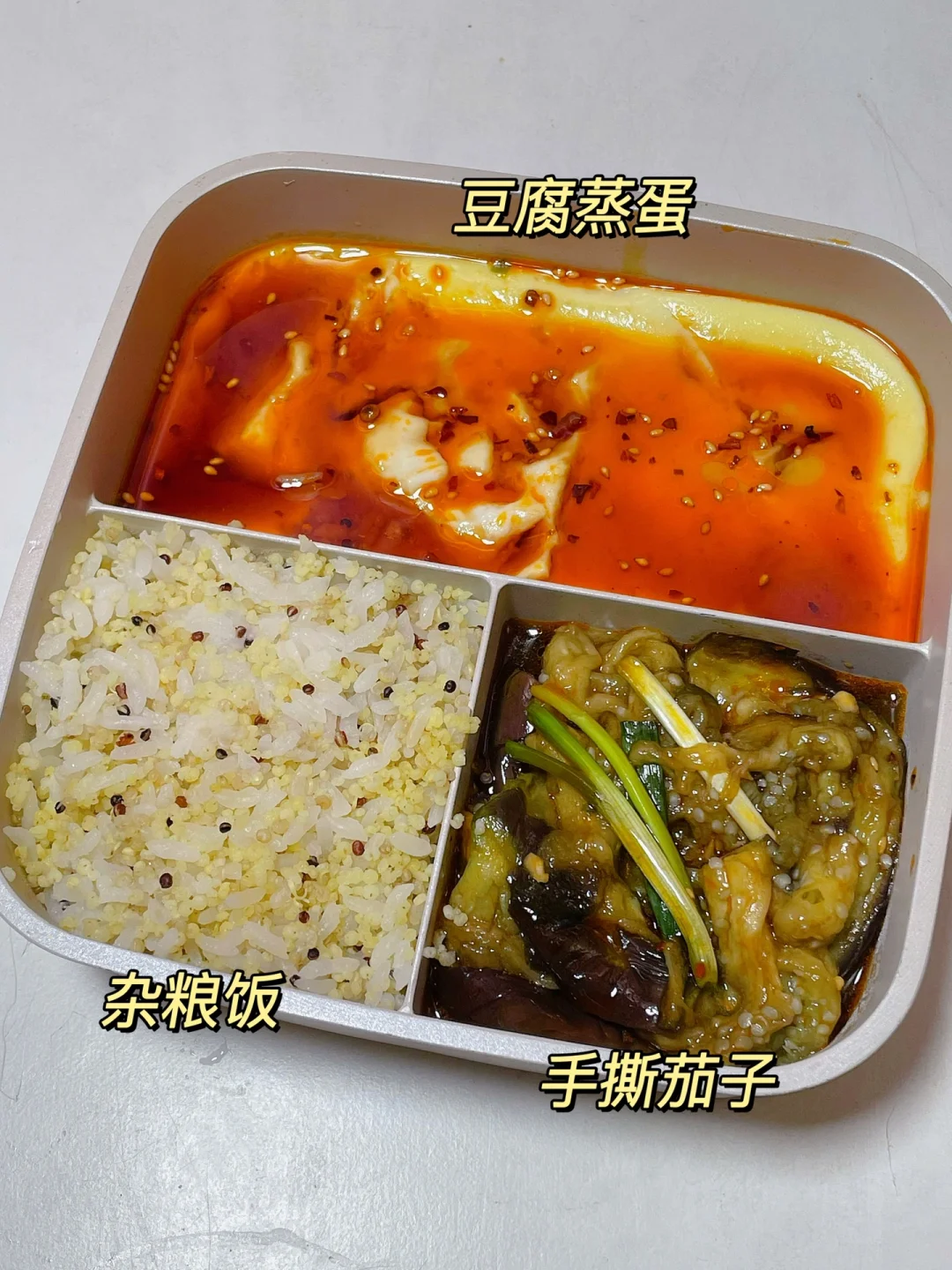 📍杂粮饭+手撕茄子+豆腐蒸蛋