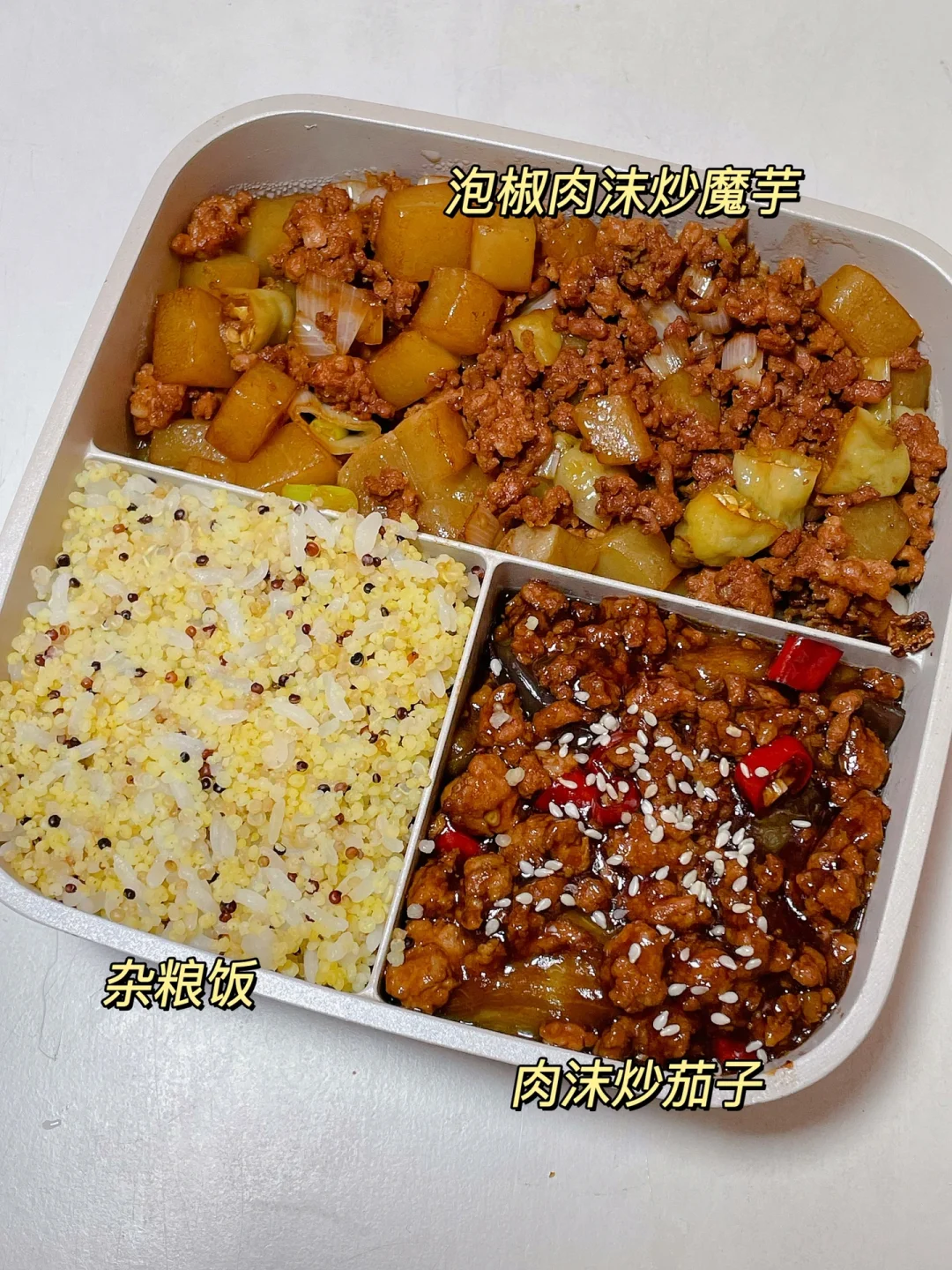 📍杂粮饭+肉沫茄子+泡椒肉沫魔芋