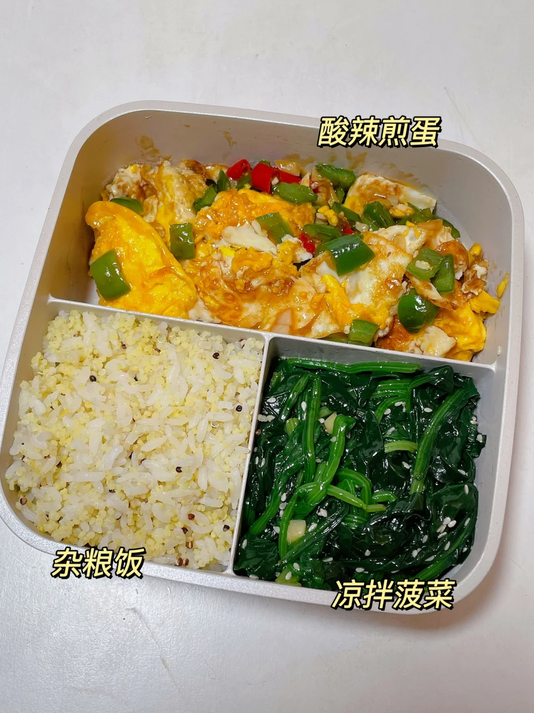 📍杂粮饭+凉拌菠菜+酸辣煎蛋