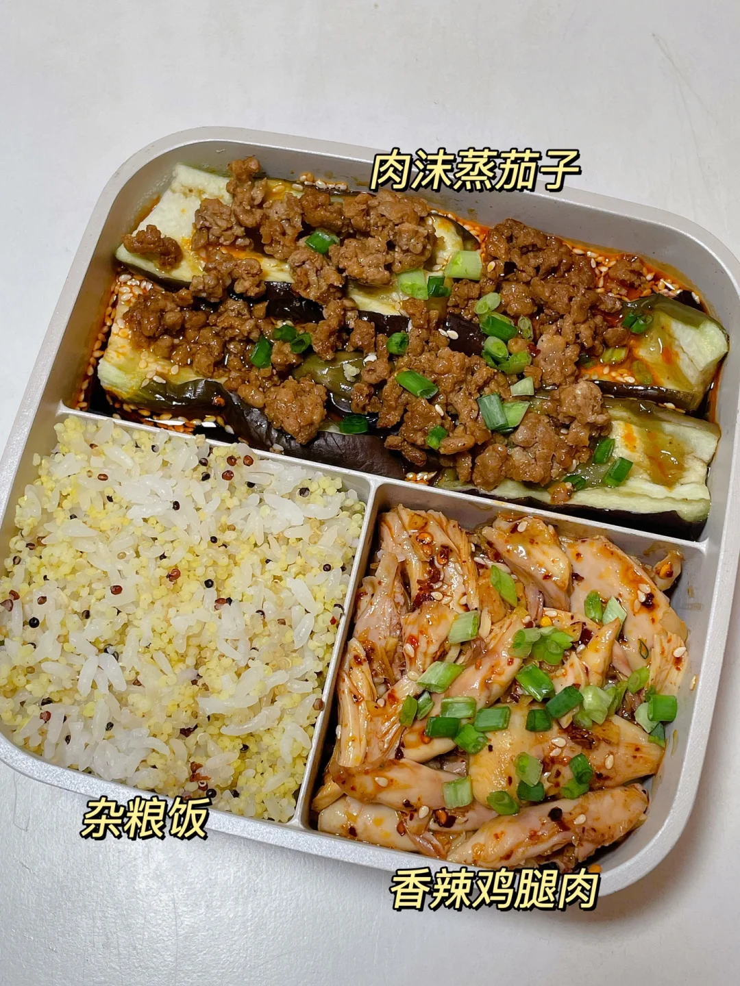 📍杂粮饭+香辣鸡腿肉+肉沫蒸茄子