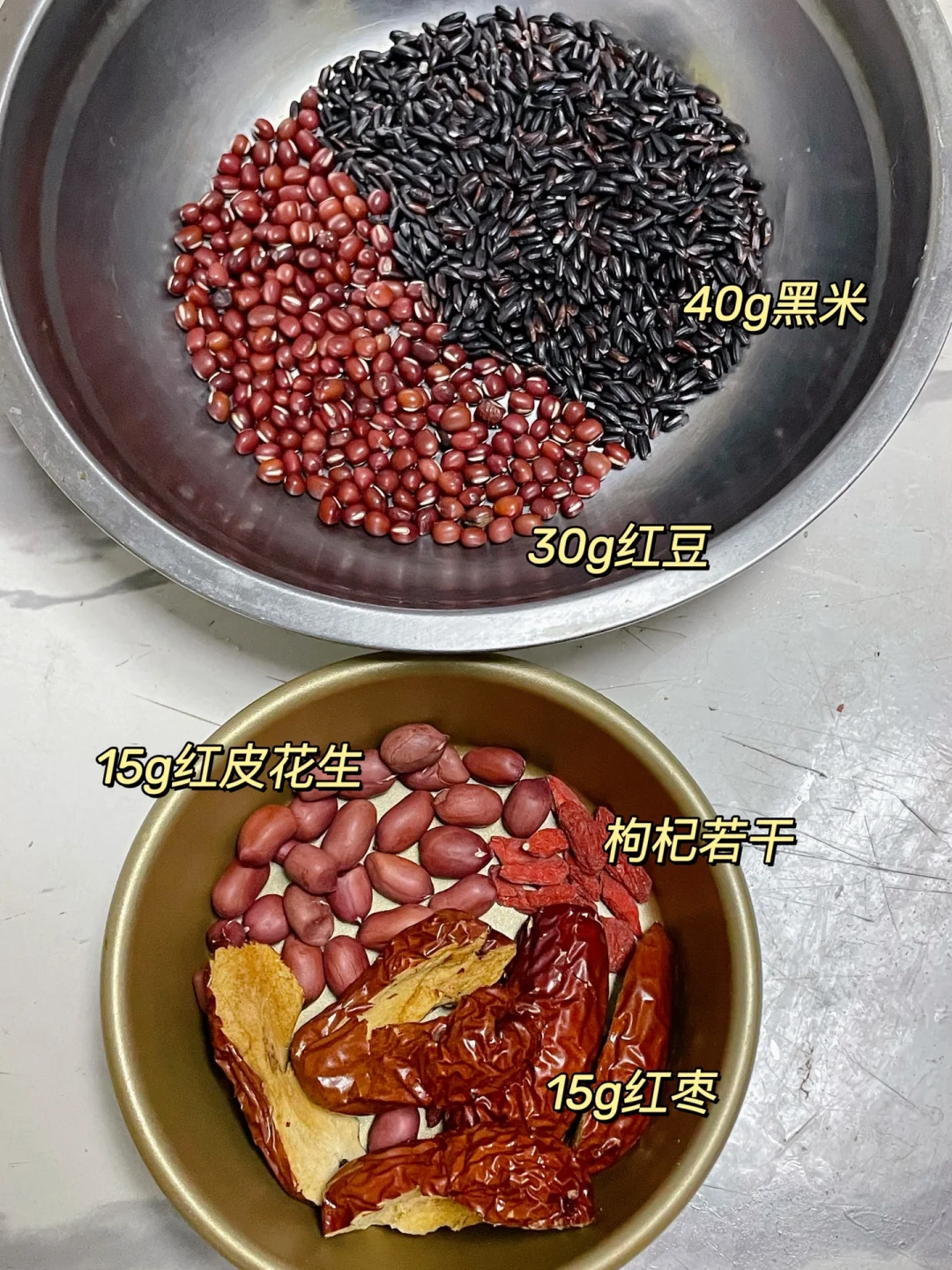 食材:红皮花生、红豆、红枣、红糖、枸杞、黑米