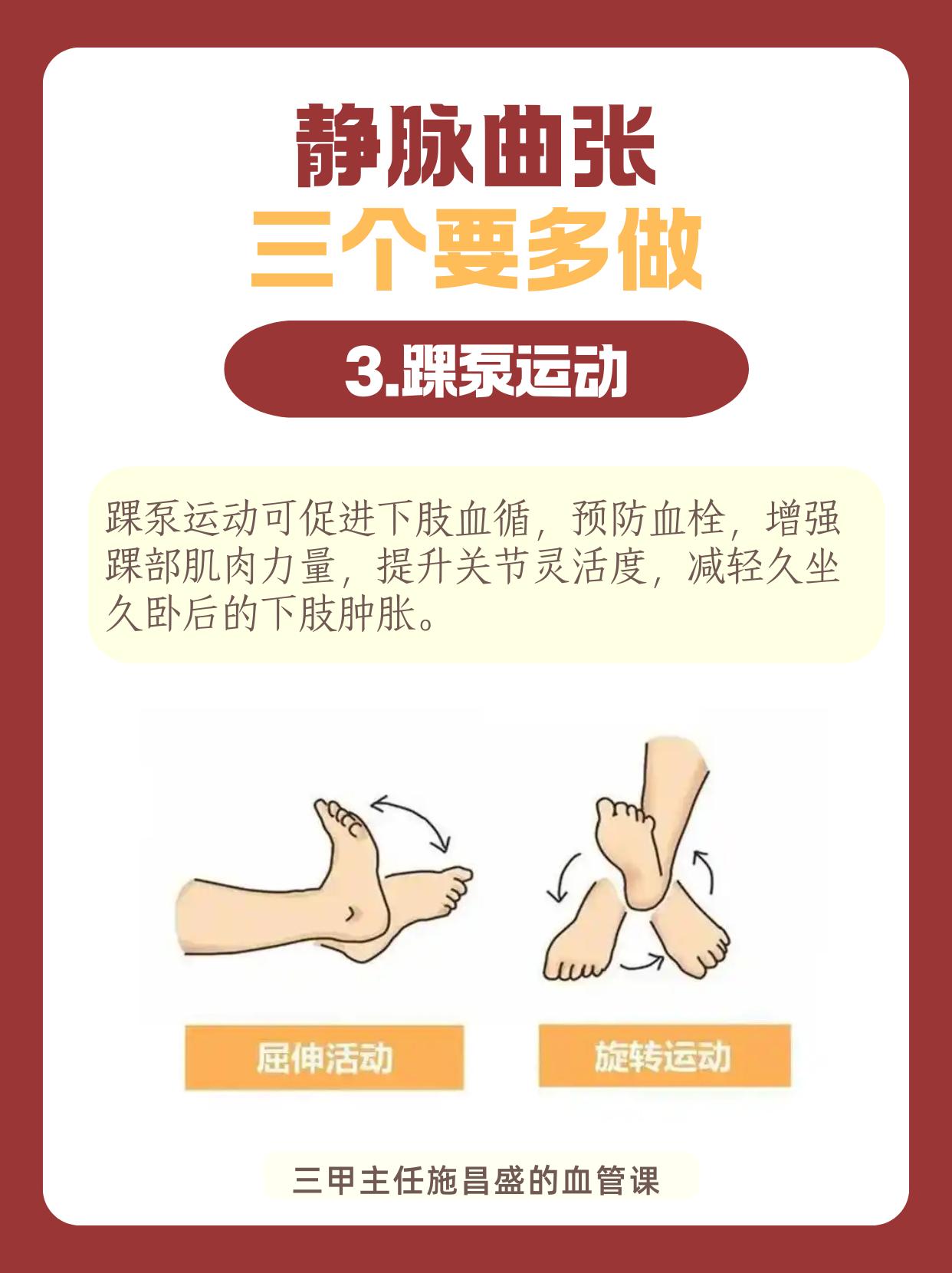 静脉曲张三个要多做。穿静脉曲张袜,压力递减助静脉回流;睡觉垫高腿,缓解久坐久站腿酸;做踝泵运动,促进下肢血循、防血栓,还能增强肌肉、提升灵活度,减轻久坐久卧后的肿胀!