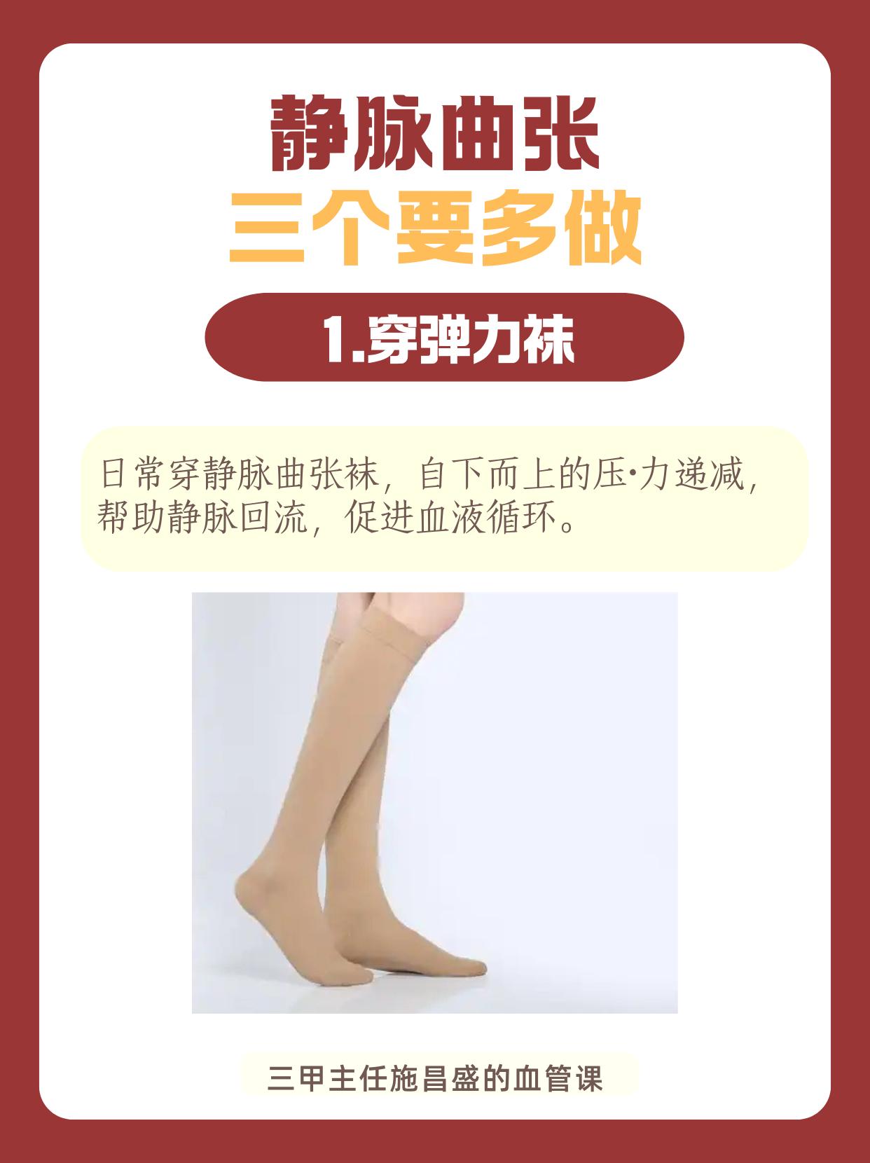 静脉曲张三个要多做。穿静脉曲张袜,压力递减助静脉回流;睡觉垫高腿,缓解...