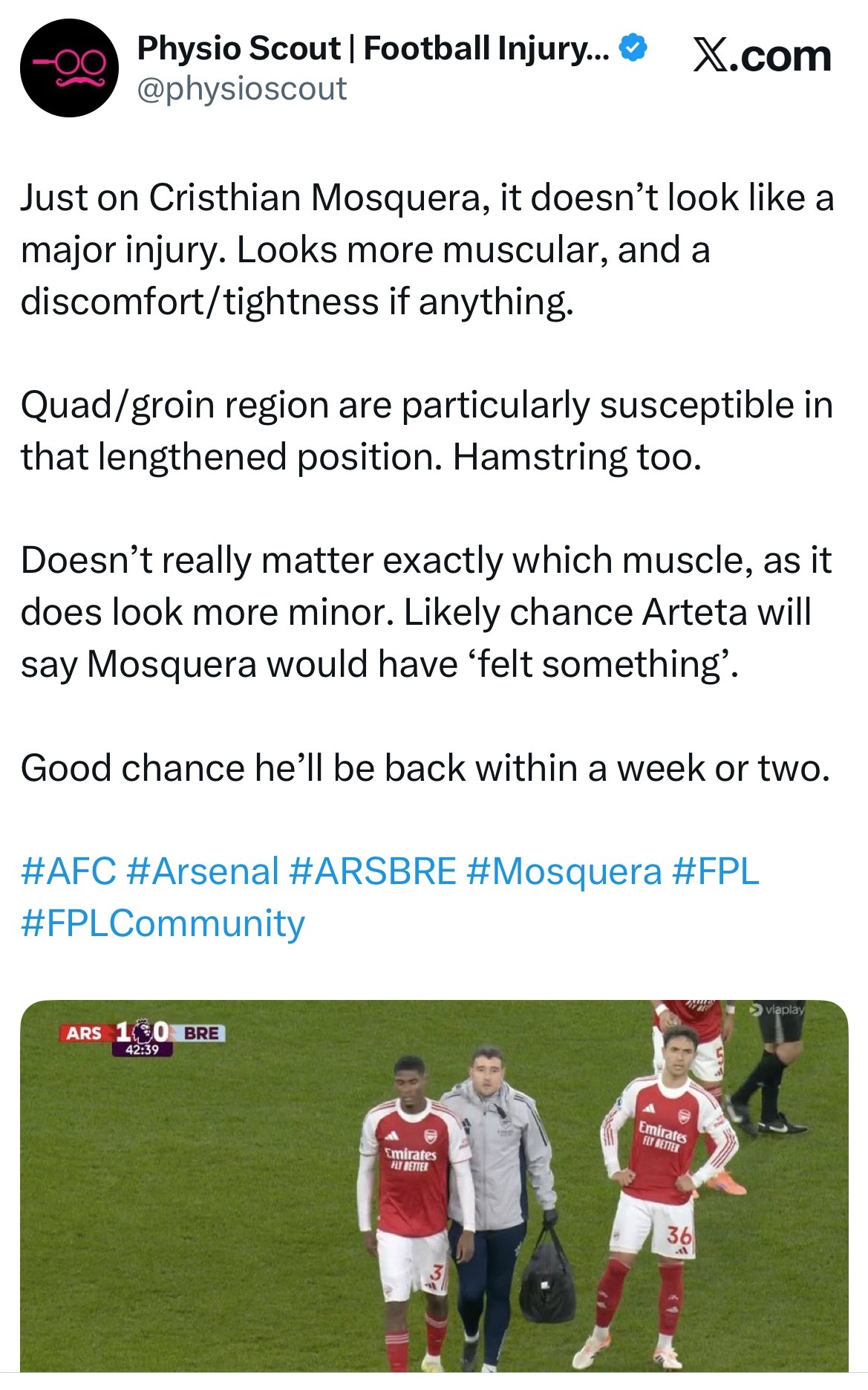 PSFI(球员伤病分析大神)关于阿森纳球员莫斯克拉的伤情分析:仅就莫斯克拉的情况而言, 这看起来不像是重大伤病。更像是肌肉问题,如果真有什么的话,也是一种不适/紧张感。在那个伸展姿势下,股四头肌/腹股沟区域尤其容易受伤。腘绳肌也是。具体是哪块肌肉其实并不重要,因为它看起来确实更偏向轻微。阿尔特塔很可能会说莫斯克拉当时"感觉到了什么"。他很有可能在一到两周内回归。