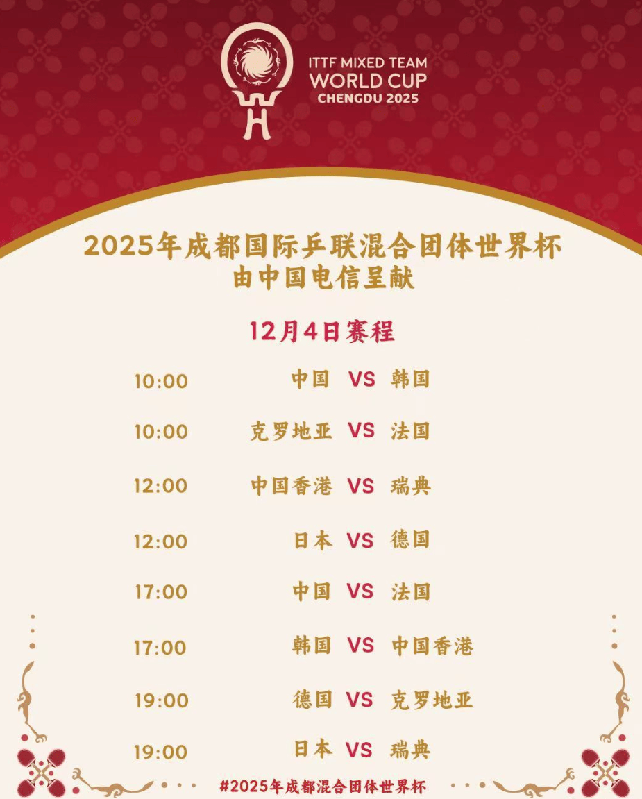 虎扑12月04日讯成都混团世界杯今日赛程公布,中国队将在今日有两场赛事,在上午10:00将迎战韩国队,下午17:00迎战法国队。
