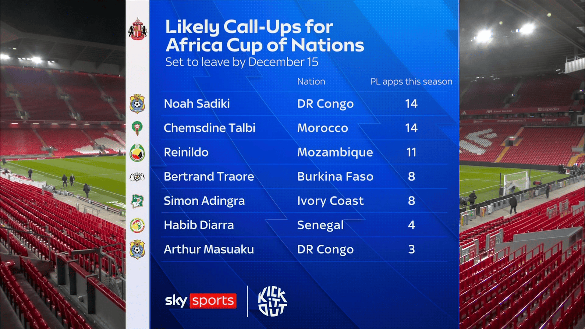 桑德兰队内可能被征召参加非洲杯的球员如下: