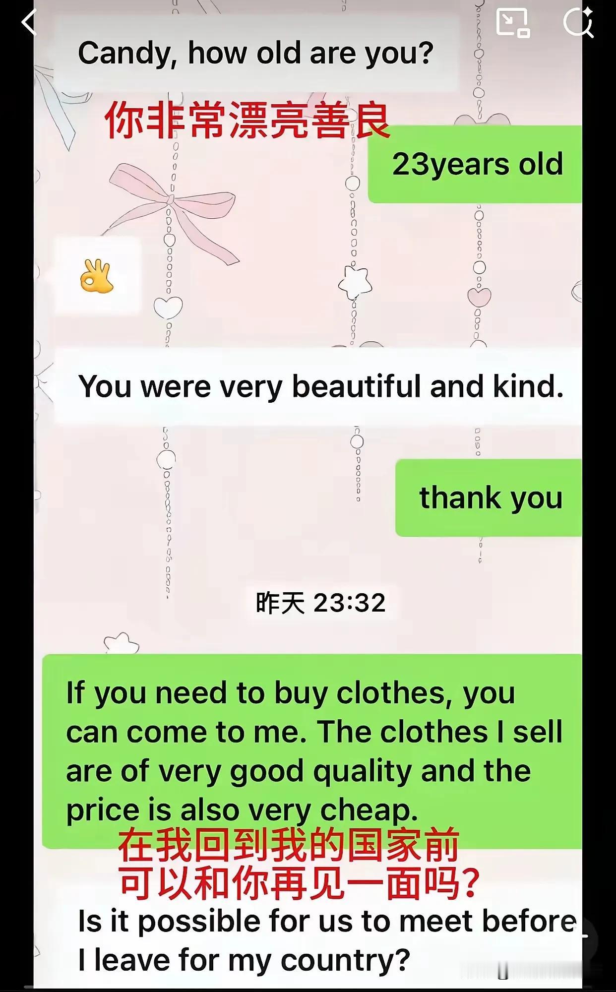 近日,浙江一姑娘在摆地摊卖男装时,迎来了一位印度顾客! 这名印度男子在她的摊位前徘徊很久,就这件看看那件摸摸的,就是不买,姑娘也没说话,就看着,之后这名印度男子就转身离开了! 谁知隔了一会,这名印度男子又折了回来 姑娘愣了一下,手里正把堆歪的牛仔外套往摊里拢,抬眼瞅着他——刚才明明捏着T恤领口摸了半天,指尖捻着布料纹理看了好一会儿,问都没问价就转身走了,这折返回来是嫌刚才没看仔细?还是要挑刺? 没等她开口,那印度男子先搓了搓手机壳,黑色壳子上沾了点灰尘,屏幕亮着微信二维码,语气有点局促,连带着口音都比刚才重了点:“我刚才没带够现金,想加你微信,之后看好尺码再找你买。”他说完,还指了指自己口袋,露出半张皱巴巴的零钱,像是在佐证这话不假。 姑娘没多想,毕竟摆摊这大半年,遇过不少忘带钱的顾客,有的转天还会特意跑回来买。她掏出手机扫了码,备注随手填了“印度顾客”,点通过的时候,瞥见他的微信头像——是个抱着小狗的男孩,看着像他弟弟。 他接过手机时,指尖碰了下她的屏幕,又赶紧缩回去,耳根有点红,笑着补了句“你人很好,没催我买东西”,说完转身走了,步子比刚才轻快不少,连背影都透着点松快。 收摊到家已是晚上十点,巷子里的路灯只剩几盏亮着,姑娘刚把装衣服的蛇皮袋拖进门,手机就震了。点开微信,是“印度顾客”发来的消息:“你好,我叫Rahul,你叫什么名字?” 姑娘蹲在地上拆蛇皮袋,牛仔裤滚出来砸在脚边,她擦了擦手上的灰,犹豫了两秒——毕竟是陌生的外国顾客,真名不好随便说,就回了自己平时用的网名“Candy”。 没半分钟,对方又发来一句:“Candy,how old are you?” 她盯着屏幕愣了愣,这问法直白得有点可爱,想了想还是回了“23years old”。紧接着,红色的汉字跳出来——“你非常漂亮善良”。 姑娘忽然笑了,刚才蹲在地上理货的累劲儿消了大半,摆摊一天碰到的不是嫌贵就是挑刺的,还是头回有顾客这么夸她,哪怕是个连价都没问的外国顾客。她指尖在屏幕上顿了顿,回了句“thank you”,还加了个微笑的表情。 没承想,对方的消息跟着就来,这次是一长段,汉字和英文叠在一起:“我在浙江待了三个月,是来谈生意的,过几天就要回印度了。你摆摊的衣服质量很好,摸起来很舒服,我很喜欢。在我回到我的国家前,可以和你再见一面吗?” 姑娘抱着手机坐在小马扎上,心里有点犯嘀咕。同住的闺蜜刚洗完澡出来,擦着头发凑过来:“谁啊?聊这么久?”姑娘把手机递过去,闺蜜扫了一眼就皱起眉:“别单独见啊,就在你摆摊的地方,晚上人多,我陪你一起,省得有啥事儿。” 姑娘觉得这话在理,把“见面的话就在我摆摊的地方吧,晚上这里人多热闹”发给Rahul,他秒回了个“OK”的手势表情,还补了句:“我会带点印度的糖果给你,是我妈妈做的,不是买的,很好吃的。” 第二天晚上摆摊,天刚擦黑,Rahul就来了。他拎着个印着橘色花纹的布袋子,老远就冲姑娘挥手,袋子口没扎紧,露出来几颗裹着银纸的糖,花花绿绿的晃眼。 他挤过买袜子的阿姨和挑T恤的学生,把袋子递过来,手指挠了挠后脑勺:“这是我妈妈做的奶糖,放了藏红花,有点甜,你尝尝。” 姑娘接过来,布料糙糙的,带着点他手心的温度。打开一看,糖块裹着彩纸,印着印度的传统图案,剥一颗放进嘴里,甜得齁人,却让她忽然松了口气——哪有存坏心思的人,会带妈妈做的糖来见陌生姑娘? 闺蜜站在旁边假装整理衣服,眼角却瞟着他俩。Rahul没在意,蹲在摊前翻牛仔外套,指尖捏着领口的缝线:“我弟弟跟你差不多大,喜欢宽松的衣服,这两件最大码的,应该合适。” 姑娘帮他把衣服叠好,算钱的时候,他非要多转二十块:“这是糖果的钱,不能让你白吃。”姑娘推了半天没推掉,只好收了,又往袋子里塞了双刚到的棉袜:“送你的,配外套穿。” 他拿着袜子愣了愣,忽然笑出了声,露出白牙:“你真的很善良,和我妈妈一样。” 两人没聊太久,Rahul说他在中国这三个月,最喜欢逛这种地摊,东西便宜还热闹,比印度的集市更方便。他翻出手机里的照片给姑娘看——是他家院子里种的茉莉,还有堆着布料的小店:“我家里也做男装生意,要是你之后有进货需求,可以找我,质量和你卖的一样好,价格更便宜,我给你寄过来。” 姑娘看着照片里开得旺的茉莉,忽然觉得挺有意思。不过是摆个普通的地摊,本来只想着赚点生活费,应付应付砍价的顾客,没成想能碰到个异国的同行,还带着妈妈做的糖来赴约,甚至想跟她做长久的生意。 各位读者你们怎么看?欢迎在评论区讨论。