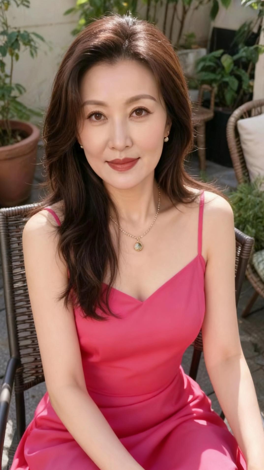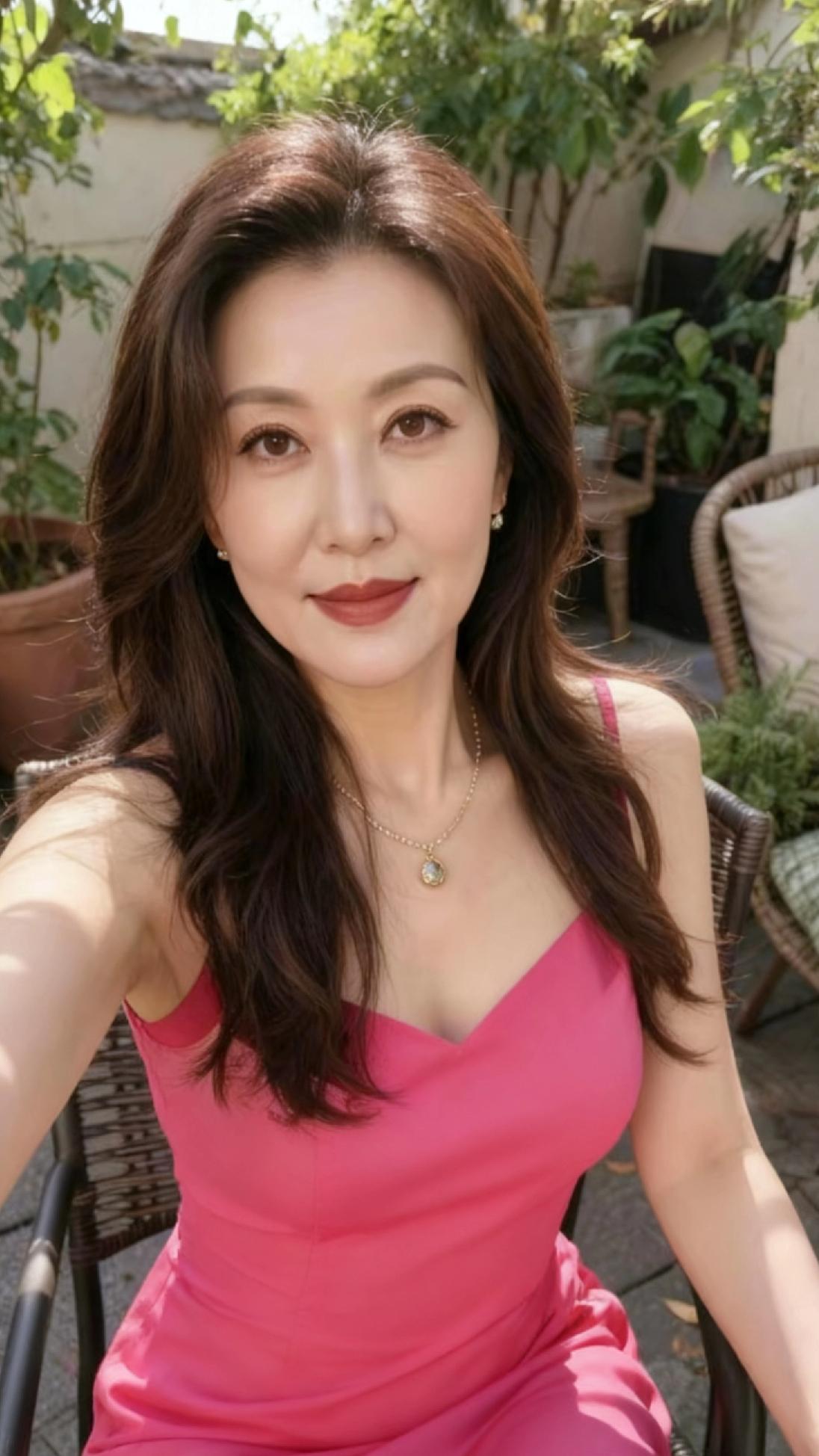 阳光下的优雅时光,粉色连衣裙与绿植相映成趣。