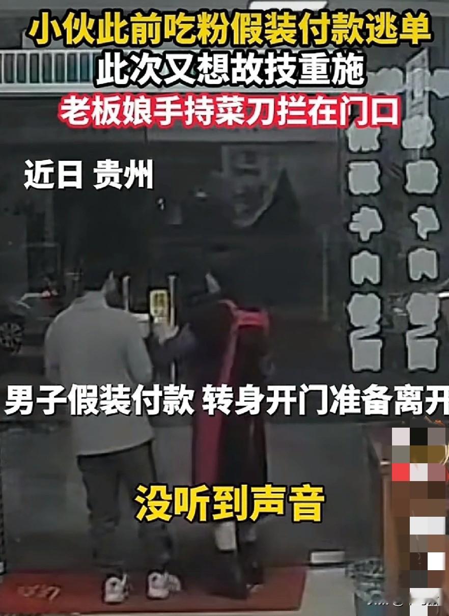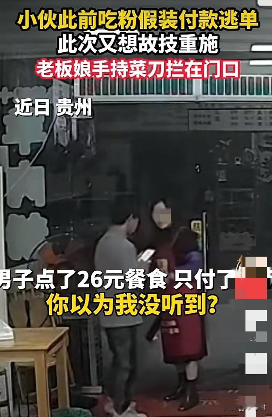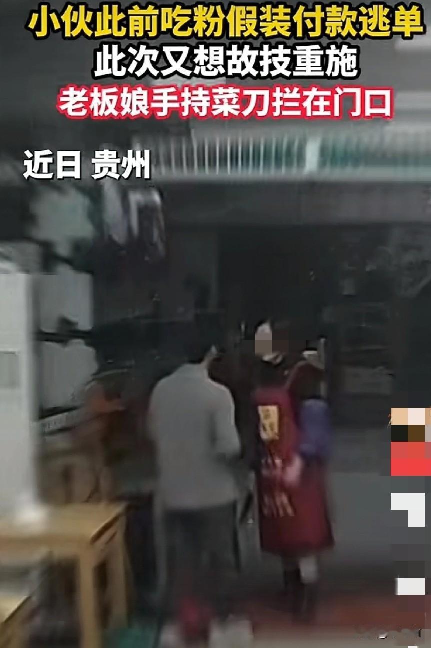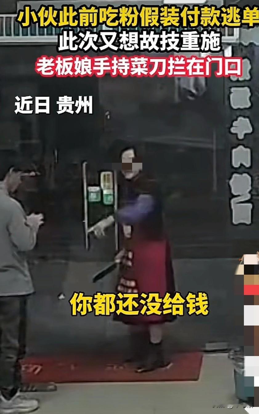 近日,贵州一家面馆店,老板娘拿着菜刀守在自家店门口,虎视眈眈的看着店内一位准备结账的小伙子。 果然老板娘预判了这位吃客的预判,他装模作样的拿出手机,翻翻点点,欲走出店外,被老板娘堵在店门,问他,“你付钱了吗?” 小伙子一言不语只往外冲,含糊着点着头,老板娘一下怒了,说你别以为我没认出你来,上次也是来店里吃饭,装着付钱的样子,大摇大摆的就走了,至今没有收到粉钱。别说上次,就连这次吃饭,收款机也没有提示收到钱了。 老板娘越说越激动,还摆弄着手里的菜刀,这次无论如何小伙子必须付钱。作为起早贪黑的生意人,老板娘挣几块的面钱也不容易啊。 男子问多少钱时,老板娘说26块,小伙子有点意外,后来估计也想明白了,老板娘把上次没付钱的一起算上了。看着走不出去,又拿着菜刀的老板娘,小伙子终于不情不愿的付款上了。 可是老板娘依旧不准他走,要他继续付完,原来这小伙子实在太精了,他只付了20块,就准备跑了,没想到上次没诚信的举动,让老板娘对他格外的主意。 见老板娘甩动着菜刀,气冲冲的样子,这位小伙子又不情愿的扫码了6块,老板娘这才打开餐馆的门,放他出去了。 这位小伙子,如果你有难处,可以直接和老板娘说,相信老板娘会体谅。可是一而再再而三的吃白食,耍聪明蒙混过关的话,这种人也迟早会被社会教育的。 (图片来自网络视频)