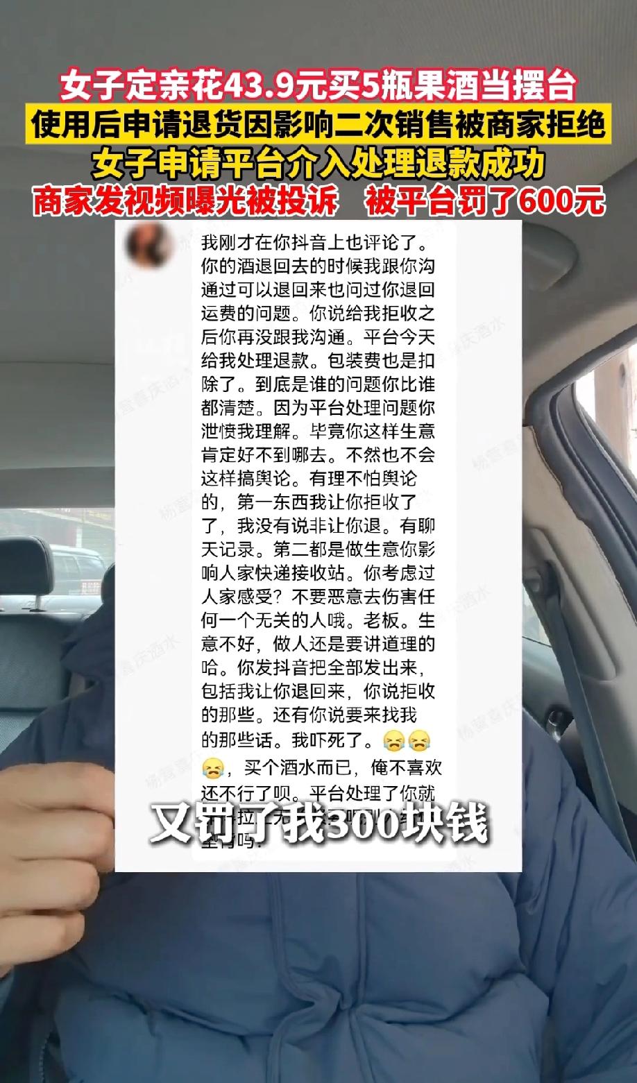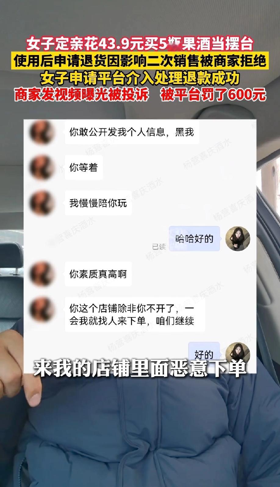 山东潍坊,一女子举行定亲仪式,为了让现场更有氛围感,就花了43.9元下单了五瓶果酒,商家发货时十分用心,不仅用白色泡沫盒装着果酒,而且还附带了一些喜字配件,想给女子的定亲宴添点彩。 可没想到,女子定亲宴后,居然以商品质量有问题申请退货退款,还让商家承担运费,商家气不过找女子理论,并且将事情发在了网上,不料,女子又找平台投诉商家泄露了她的隐私,导致商家被平台罚了600元! 商家收到退货包裹时直接傻了眼:原本的白色泡沫包装没了,保护泡沫也不见踪影,送的喜字配件都绑在酒瓶上用过了,瓶子本身也有明显的使用痕迹,这明摆着影响二次销售了。 换谁当商家,这时候也不会同意退货啊,商家当场就拒收了,还驳回了退款申请。 商家还特意跟李女士沟通,把退货的关键问题说清楚:一是包装全毁了,二是商品和配件都用过了,根本没法再卖。 而且李女士还撒谎说商品有质量问题,想让商家承担退货运费,这就更说不过去了。可李女士根本不听,直接找平台介入。 让商家没想到的是,平台最后居然判李女士赢了,全额给她退了款。 商家这气就不打一处来,自己好好的商品被人当免费道具用了,最后钱货两空,任谁都得憋屈。 情急之下,他拍了个视频发到网上,把这事的来龙去脉说了说,想让大家评评理。 可视频发出去没一会儿,他就被李女士投诉了,说他泄露个人信息、网暴自己。紧接着平台就给商家来了个处罚通知,罚了他600元。 更让商家糟心的是,李女士还跑到他店里威胁,说“你敢公开我信息,这店你就别想开了,我马上找人来下单折腾你”。 商家拿出聊天记录,证明自己早就拒收了包裹,也沟通过运费的事,可对方根本不理,反倒指责商家发视频搞事情。好好的生意没做成,还惹了一肚子气,商家真是有苦说不出。 在我看来,这事儿里,李女士的做法实在是说不过去。 把商品用做定亲摆台,明显是已经使用过了,包装损坏、配件用旧,这完全就是“影响二次销售”,商家拒绝退货是合情合理的。 而且李女士还撒谎说商品有质量问题,就为了让商家承担运费,这简直就是免费蹭了摆台道具,最后还成功退款,太不地道了。 再看商家这边,虽然被气得不轻,但确实不该在网上发布李女士的相关内容,平台因为这个罚他,也是因为他涉及了个人信息泄露,这一点商家做得确实不对,维权也得守规矩。 但平台的判定也让人有点摸不着头脑,明明商品已经被使用了,却还是支持李女士退货,这无疑是损害了商家的合法权益,长此以往,只会让更多人钻空子。 说到底,不管是消费者还是商家,都得有底线。消费者享受权益的时候,不能滥用规则,把商家的商品当免费工具。 商家遇到纠纷可以通过平台正规渠道维权,没必要用曝光的方式激化矛盾。 平台作为中间方,更得公平公正,不能偏袒任何一方,得拿出让双方都信服的判定标准。 不然最后,消费者丢了诚信,商家寒了心,平台也没了公信力,三方都吃亏。
