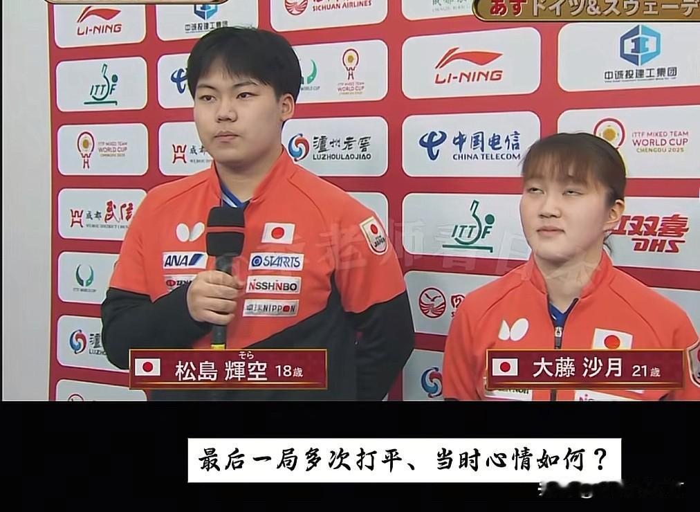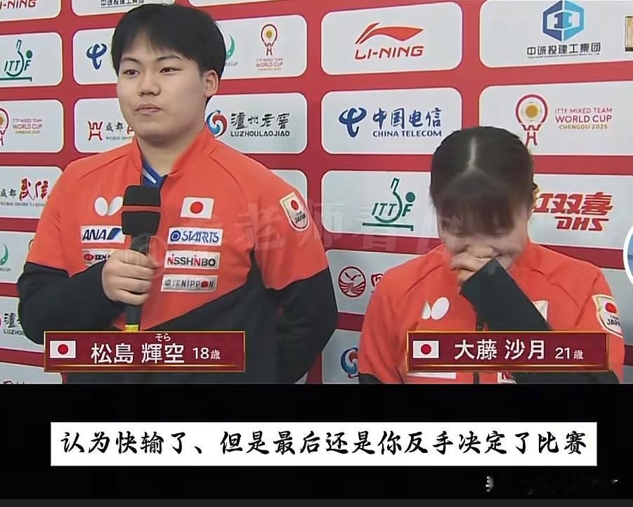 松岛辉空说认为快输了,最后还是反手决定了比赛 松岛辉空大藤沙月2:1黄镇廷杜凯琹 赛后记者问:最后一局,多次打平,当时心情如何? 松岛辉空回答:认为快输了,但最后还是反手决定了比赛。 松岛辉空说的大藤沙月都忍不住笑 第三局松岛辉空大藤沙月18:16战胜黄镇廷杜凯琹。双方打得都非常好👍