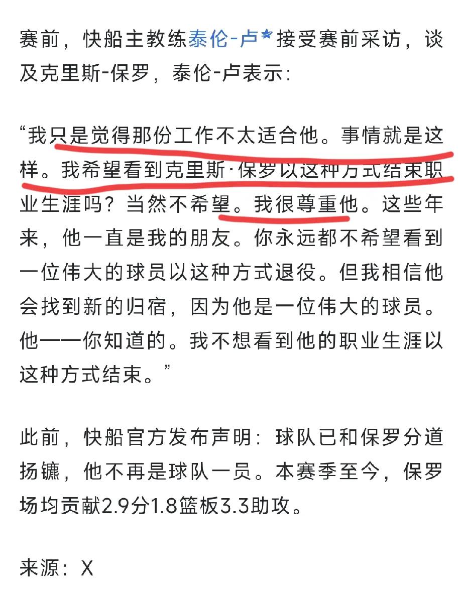 伪君子吗?今天对阵老鹰赛前泰伦卢接受采访称:让保罗回家不是我的决定,我很尊重保罗,这些年,他一直都是我的好朋友,我也不希望他用这种方式结束自己的职业生涯! 泰伦卢知道这次惹麻烦了,赶紧给自己开脱,希望外界不要再说自己了吧。但是谁不知道保罗离队最大就是因为他!