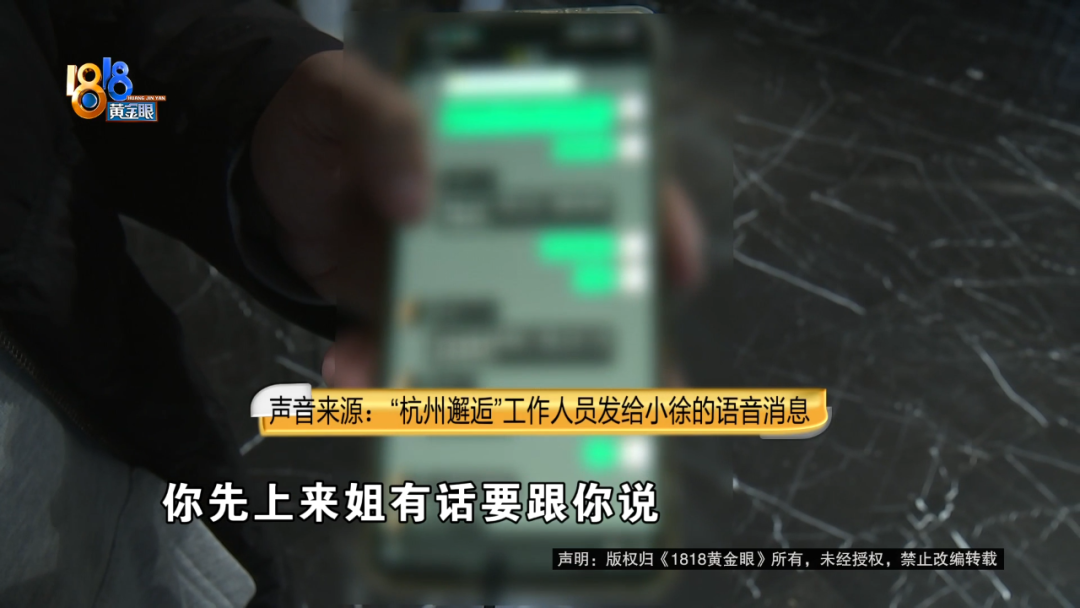 “杭州邂逅”工作人员发给小徐的语音消息:你先上来,你先上来姐有话要跟你说。你先别管他到没到,你先上来姐有话要先跟你说。你上来了没呀?宝贝,我们第一次见面的地方,你先上来,快点。