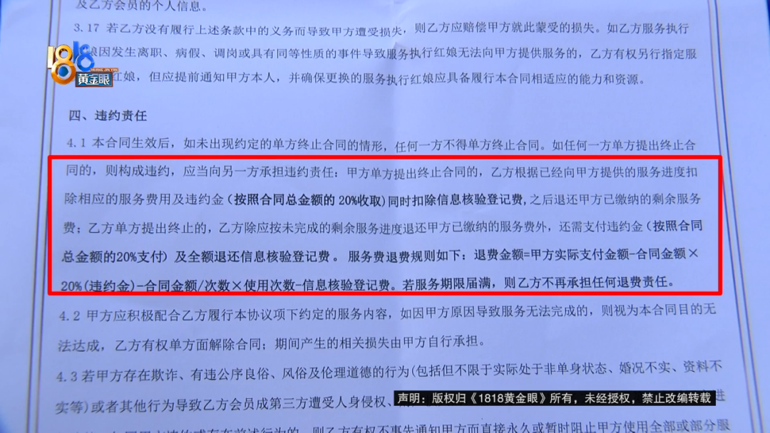 小徐:我没有仔细看。口头承诺和合同上的完全不一样,但我肯定是奔着他们口头承诺去的。当时说的是一周可以约见2到3个男生,一共服务周期是4个月,那我就想大概可以见30个男孩子。我的诉求是我愿意支付这个违约金,但是这个人数(费用)我不愿意支付。