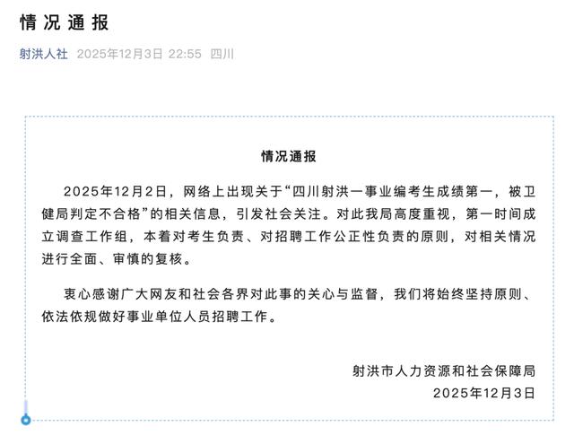 四川射洪市人力资源和社会保障局12月3日晚发布情况通报:2025年12月2日,网络上出现关于“四川射洪一事业编考生成绩第一,被卫健局判定不合格”的相关信息,引发社会关注。对此我局高度重视,第一时间成立调查工作组,本着对考生负责、对招聘工作公正性负责的原则,对相关情况进行全面、审慎的复核。