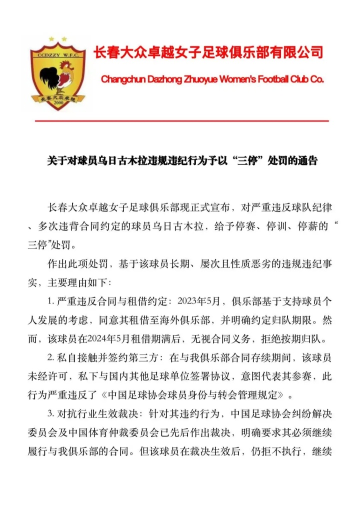 直播吧12月04日讯女超俱乐部长春大众卓越女足发布处罚通告,女足国脚乌日古木拉被“三停”处罚,触犯5项违规违纪。