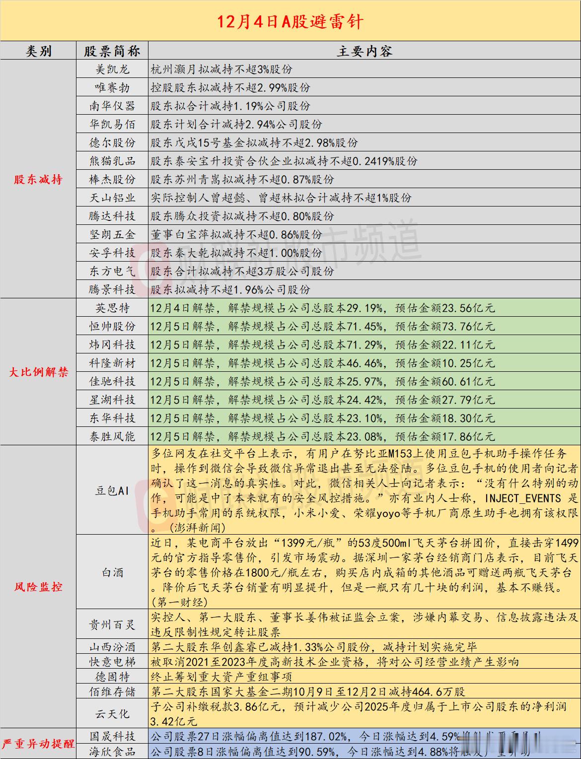 【12月4日投资避雷针:这家上市公司实控人涉嫌内幕交易、信披违法及违规转让股票】近日,A股及海外市场潜在风险事件如下。国内经济信息方面包括:1)国内商品期市夜盘收盘多数下跌,化工品跌幅居前;2)豆包手机助手触发微信账号强制下线;公司方面重点关注包括:1)贵州百灵实控人、第一大股东、董事长姜伟被证监会立案,涉嫌内幕交易、信息披露违法及违反限制性规定转让股票;2)山西汾酒第二大股东华创鑫睿已减持1.33%公司股份,减持计划实施完毕;海外市场重点关注包括:1)纳斯达克中国金龙指数收跌1.38%;2)美国11月ADP就业人数减少3.2万人,不及市场预期。