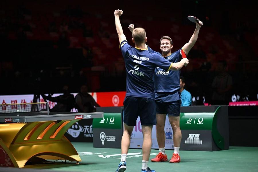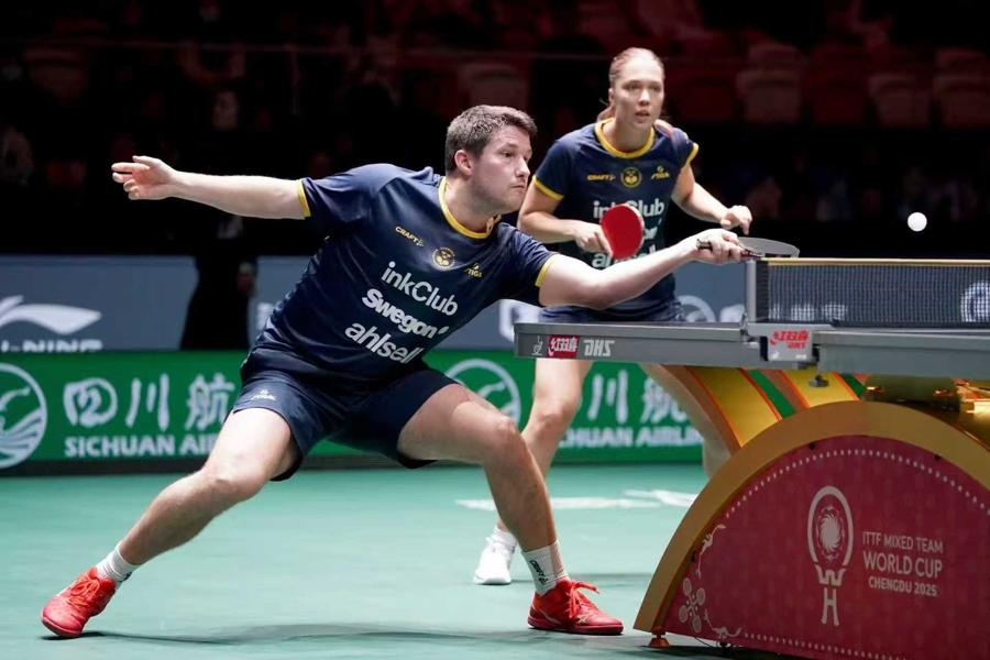 成都乒乓球混合团体世界杯第二阶段首轮一场遭遇战,小组赛三连胜的德国队对阵瑞典队,首盘混双,瑞典队的克里斯蒂娜·卡尔伯格/克里斯蒂安·卡尔森1-2遭德国队的安妮特·考夫曼/弗朗西斯卡逆转,开局不利,第二盘女单,瑞典队的琳达·博格斯特隆以13-11、8-11、16-14险胜德国名将沙宾·温特,为瑞典队扳平比分,第三盘男单,德国队的邱党以11-9、11-9、18-16艰难战胜安东·卡尔伯格,帮助德国队6-3领先,第四盘男双,卡尔伯格继续登场,携手卡尔森2-1力克杜达/邱党,将比赛悬念推至第五盘女双,瑞典队的克里斯蒂娜·卡尔伯格/伯格斯特隆虽连续挽救局点,最终还是以10-12负于德国队的米特兰姆/温特,13局较量有9局仅差2分,6局打到超分,最终德国队8-5战胜瑞典队,和中国队、韩国队、日本队一样收获四连胜。