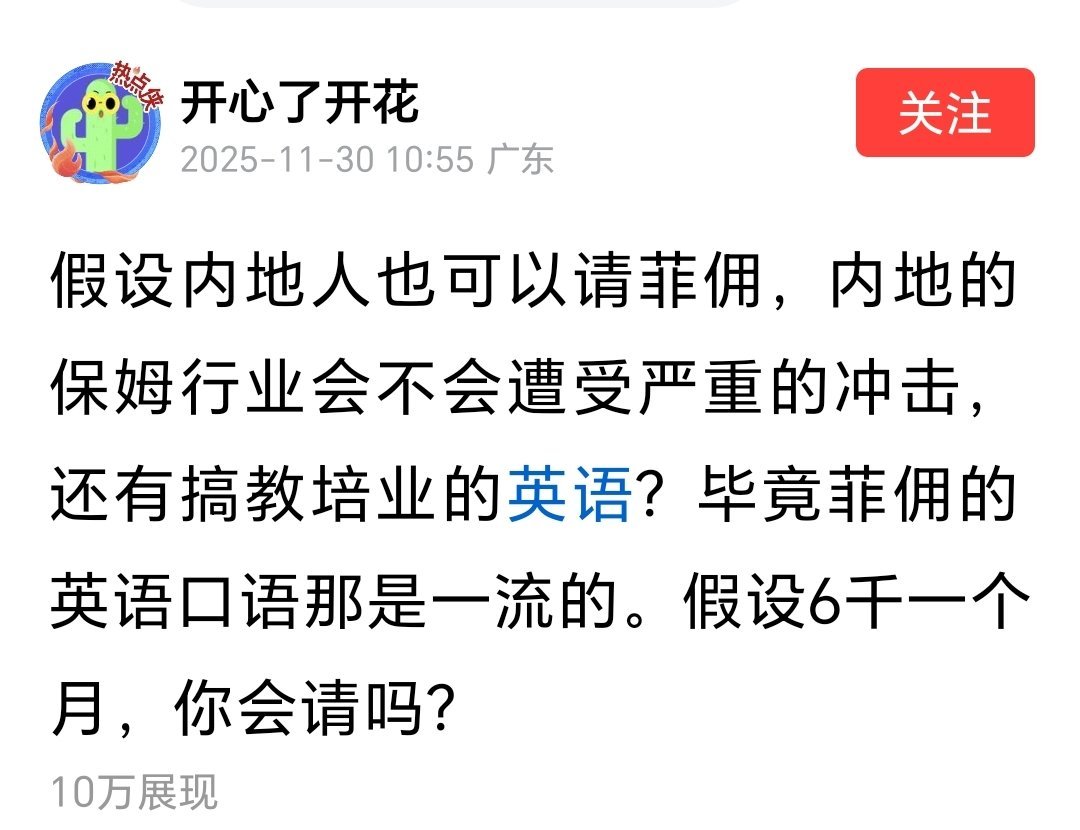 刚刷到的,网友说内地要能请菲佣,家政圈估计得卷翻天!英语溜还肯干活,六千一个月放今天可真不算贵。不过咱们这边的保姆行业怕是要抖三抖,连教孩子英语的培训班都可能被挤掉——毕竟人家张口就是标准口语。这价给你,你会请吗?