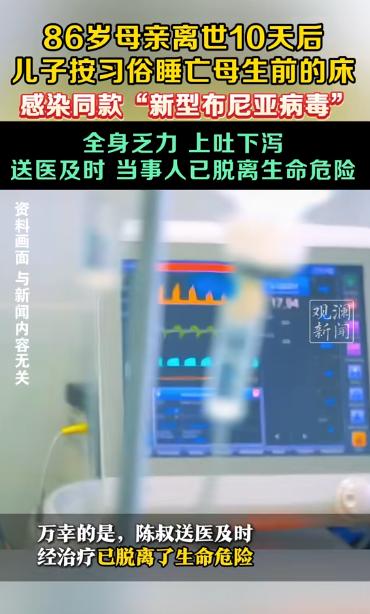 浙江一86岁老人突然离世,儿子按习俗,睡在母亲生前睡觉的床上,想陪老人安心上路。结果,没过多久,他也出现了和母亲相同的症状,所幸送医及时,经治疗已脱离了生命危险,但是,这到底怎么回事?   浙江的孙先生(化名),最近经历了一场让他后怕一辈子的事,前几天他突然开始高烧,上吐下泻,浑身没力气,连站起来都费劲,家里人一看情况不对,赶紧把他送进医院。   抽血结果出来的时候,孙先生心里 “咯噔” 一下,这不跟半个月前母亲生病时的情况一模一样吗?   孙先生的母亲今年 86 岁,身体一直很硬朗,平时连感冒都少见,可就在半个月前,老人突然开始拉肚子,吃不下东西,全身还酸痛,家里人一开始以为就是普通肠胃炎,给老人煮了清淡的粥,还买了止泻药和补液盐。   谁知道吃了药一点用都没有,老人的情况反而越来越糟,到了第三天,老人已经虚弱得起不了床,体温一直降不下来,这时候家人才慌了,赶紧叫车把老人送进医院。   医院检查后发现,老人不光血小板和白细胞异常,肝功能也出了问题,医生怀疑是病毒性感染,赶紧抽血送检,同时给老人做对症治疗,可病毒发展得太快,老人年纪又大,身体扛不住,没几天就走了。   家里人都沉浸在悲痛里,按照当地特有的风俗亲人要在逝者的床上再睡一夜,算是陪亲人最后一程,十天后,孙先生强忍着难过,睡在了母亲生前的床上,房间里母亲的被褥、衣服都没动,也没做消毒。     当时只想着尽一份心意,哪能想到这会让自己也染上病。   医生结合孙先生的情况很快有了结论,他感染了新型布尼亚病毒,这种病毒大多是被蜱虫叮咬传播的,潜伏期能有好几天甚至好几周。   孙先生的母亲很可能是在因为在外面或者干活的时候的被咬伤才感染的,一开始没当回事,耽误了治疗,最后才酿成悲剧。   至于孙先生,医生分析大概率是因为接触了母亲的生活用品,老人用过的床铺、衣物上,可能残留了蜱虫或者病毒,加上房间没消毒,他睡在那张床上,就这么被传染了。   不过医生也说了,这种病毒不会轻易通过空气传播,大多是接触到体液、血液,或者被带病毒的蜱虫咬了才会发病,孙先生属于在同一个居住环境里暴露感染的。   还好送医及时,孙先生接受了抗病毒治疗,还补了液,医生也帮他维持器官功能、提升血小板,现在他的病情已经稳定下来,总算脱离了生命危险。   这件事传开后,好多网友都在讨论,有人说老人走得太可惜了,也庆幸孙先生能保住性命,还有人提醒,农村夏秋季在田里干活的人最容易被蜱虫咬,出门一定要穿长袖长裤,回家后赶紧检查皮肤有没有异样。   医生也借着这件事提醒大家,新型布尼亚病毒不算少见,一旦感染,可能会快速损伤多个器官,病情很凶险,能不能治好,关键就在早发现、早治疗。   好好的一家人,因为一只小小的蜱虫遭遇这样的事,想想都让人难受,这也给大家提了个醒,平时对自然界里那些可能传播疾病的虫子多上点心,做好防护,总比出事之后后悔强。 信息来源: 观澜新闻