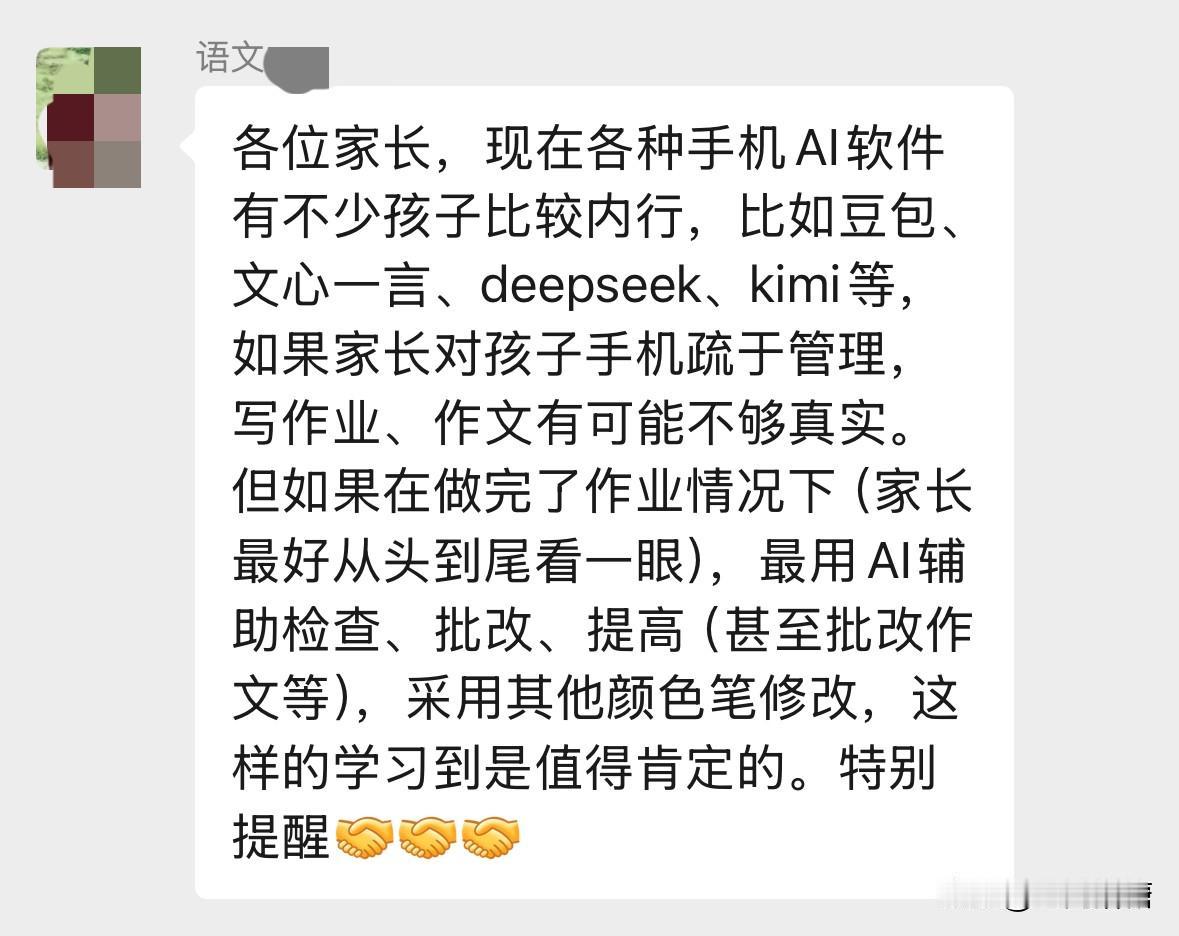 近段时间,各科老师经常在群里反映,有些孩子天天提交“完美作业”:数学作业一题不错、英语作业全是标准答案、语文作文文采斐然;可是一到考试就露了馅:数学公式写不全、英语语法搞不懂,语文作文写不通,成绩惨不忍睹。 究其原因,想必大家也想到了,就是孩子写作业时找了得力帮手:手机。数学英语扫一扫,正确答案就立马奉上;语文作文更好办,AI软件输入题目和字数的指令,五秒钟就给出一篇优秀文章。 老师们天天在群里苦口婆心,让家长管控好孩子用手机,至少写作业的时候不要给,但似乎效果不大。还有的孩子学“聪明”了,在抄正确答案的时候故意写错一题两题,妄想蒙混过关,但老师哪里会看不出来,只能在群里日复一日地唠叨了,可遇上不配合的家长,老师们也是心里苦呀[捂脸]