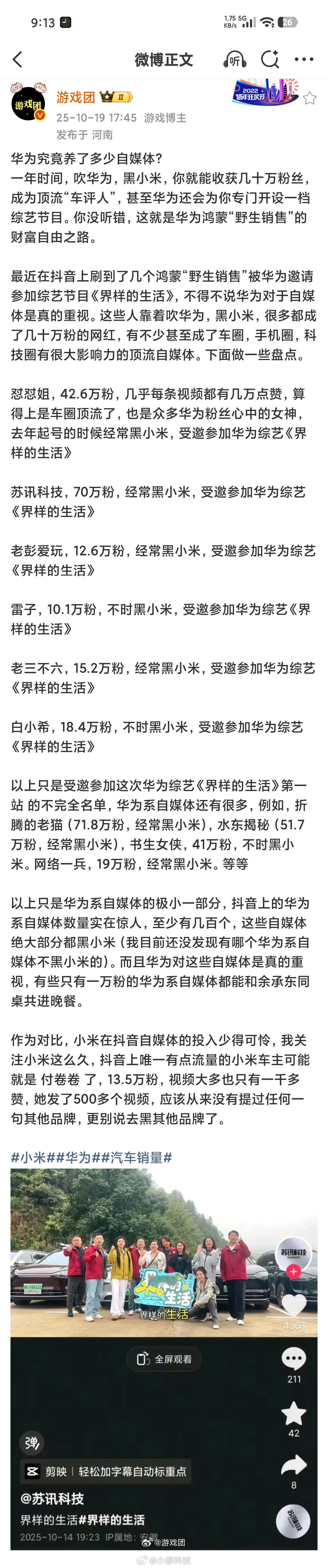 某3百万粉丝的游戏博主:华为究竟养了多少自媒体