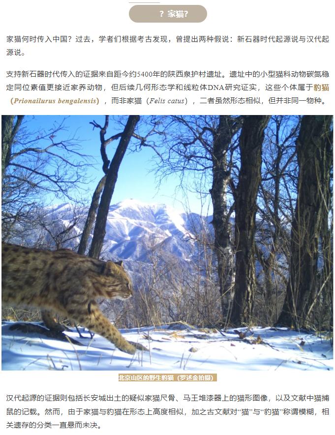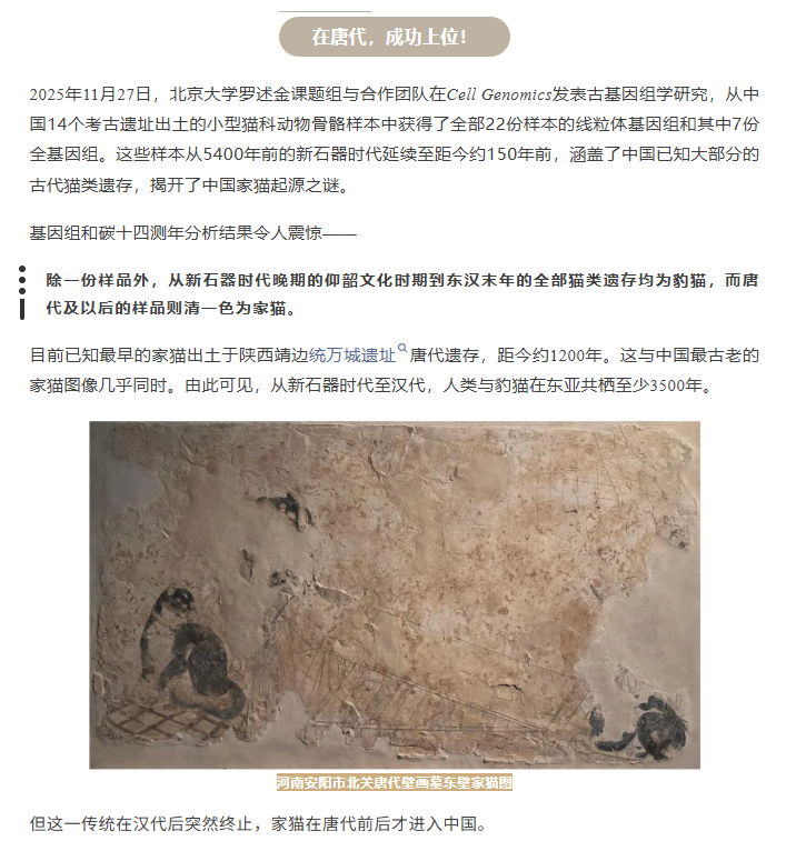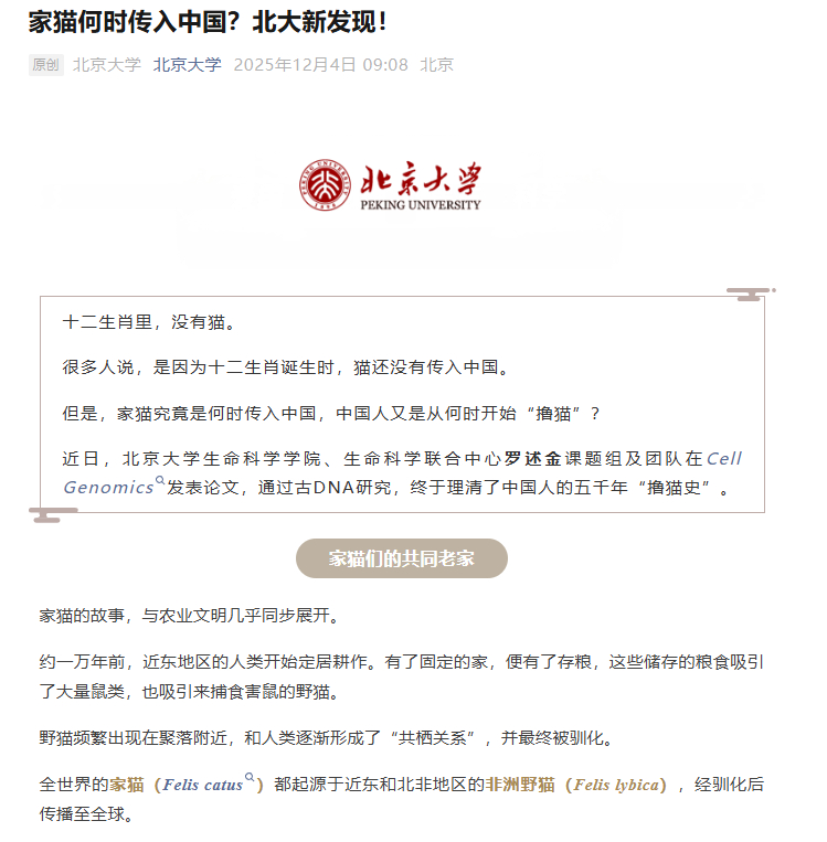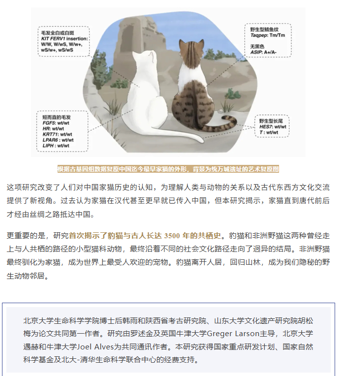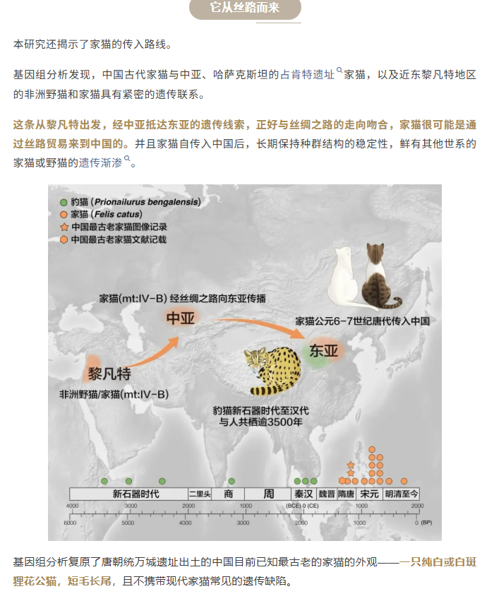 【北大发现家猫起源】猫走丝绸之路来中国今晚回家把这段历史讲给我家咪听!据北京大学公众号,近日,北京大学生命科学学院、生命科学联合中心罗述金课题组及团队发表论文,通过古DNA研究,终于理清了中国人的五千年“撸猫史”,小鱼妹儿给大家画个重点:1、全世界的家猫都起源于近东和北非地区的非洲野猫,经驯化后传播至全球;2、豹猫和家猫,二者虽然形态相似,但并非同一物种;3、从新石器时代至汉代,人类与豹猫在东亚共栖至少3500年;4、汉末至隋唐之间农业衰落人口锐减,破坏了豹猫依赖的共栖环境;5、隋唐重归繁荣,家猫通过丝绸之路进入中国;6、中国目前已知最古老的家猫的外观—— 一只纯白或白斑狸花公猫,短毛长尾,且不携带现代家猫常见的遗传缺陷。