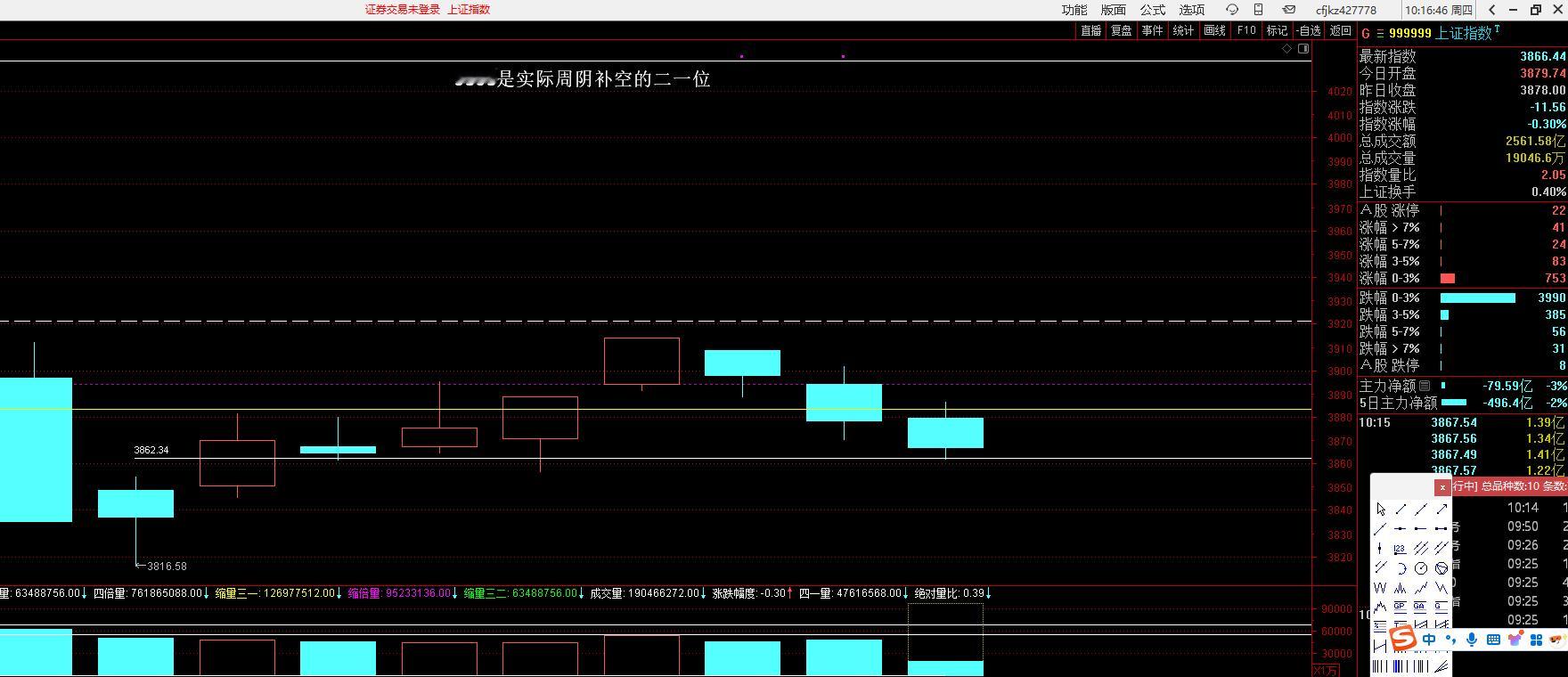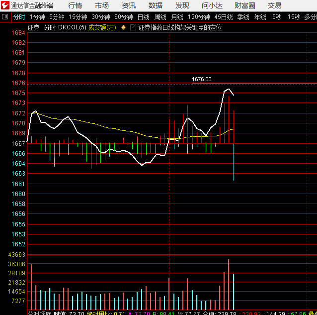证券指数碰了一下大阴二一位(图1),但是东方财富弱一些(图2)、同时上证是阴线,