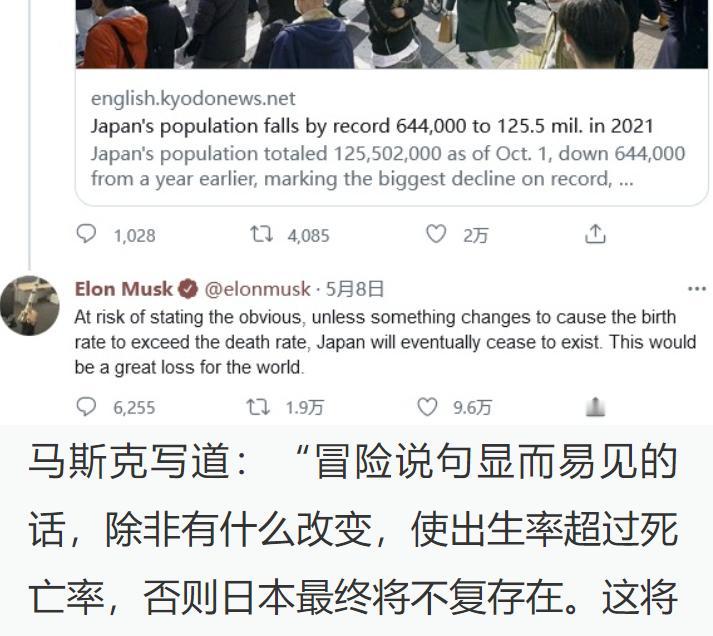 不得不说,马斯克这嘴真是开过光!就在中日关系这么紧张的节骨眼上,他居然直接给日本的未来判了“死刑”。 早两年马斯克就在社交平台上说过:“日本出生率要是赶不上死亡率,最后得没了。” 当时不少人觉得他是夸大其词,可2025年最新数据一出来,谁都没法再不当回事,这一年日本人口又少了90多万,算下来已经是连续16年下滑了,这样的下滑速度要是一直没改观,真不敢想未来会是什么样。 从数据变化就能看出来趋势有多吓人,2018年的时候日本常住人口还有12681.1万人,到2023年就降到了12451.67万人,短短五年时间就少了两百多万人,2025年这一年的减少量就快赶上之前两年的总和,照这个速度下去,人口减少的幅度只会越来越大。 年轻人不愿意结婚生子是核心原因,毕竟在日本,不结婚基本就不会有孩子,婚外生育率连3%都不到。 现在日本男人里差不多每三个就有一个可能一辈子不结婚,女人里每四个就有一个,这样的终身未婚率还在往上涨,国立社会保障·人口问题研究所都预测到2030年这个比例会更高。 很多人不是不想结婚,是真的结不起也不敢结,日本内阁府早就做过调查,超过一半的人说不结婚是因为没遇到合适的对象,可背后藏着的其实是经济压力。 现在日本的年轻人,找份稳定工作特别难,2023年的时候,非正式员工就有2124万人,占到所有雇佣者的37.1%,这些工作工资不高还没保障,手里没份稳定的收入,连自己都养得费劲,哪敢琢磨结婚的事。 就算有人敢结婚,生孩子的成本也让他们望而却步。 从怀孕检查到孩子出生,再到之后的教育、医疗,每一笔都是不小的开支。 日本政府不是没意识到问题,从上世纪90年代的《天使计划》开始,搞了三十年的少子化对策,又是给育儿补贴又是优化入园制度,可效果一直不好,2024年生育率都跌到1.15了,出生人口只有68.6万,都是二战后的最低值。 今年还计划搞个“儿童与育儿支援金”,说是给育儿家庭补贴,可钱要从全体国民手里收,单身人士和丁克家庭交了钱拿不回来,被骂成“单身税”,闹得沸沸扬扬。 可就算补贴到位,年轻人还是不敢生,东京大学有教授就说,关键是就业和收入没保障,光靠补贴根本没用。 出生率上不去,死亡率却一直在降不下来,这一升一降就让人口负增长的窟窿越来越大。 现在日本65岁以上的老人有3625万人,占总人口的29.3%,是全球老龄化最严重的国家之一,其中75岁以上的就有2076万人,80岁以上的也超过了1290万。 这么多老人,自然死亡率低不了,而能生孩子的年轻人却越来越少,形成了恶性循环。 老龄化还带来了劳动力短缺的问题,工厂招不到人,服务业缺人手,没办法只能让老人继续上班,2023年的时候,65岁以上还在工作的老人有914万人,连续20年增加,每7个在职人员里就有1个是65岁以上的老人,批发零售、医疗福利这些行业里,高龄从业者一抓一大把。 为了补劳动力的缺口,日本只能越来越依赖外籍劳工,2023年在日本工作的外国人已经有205万,比2011年翻了近两倍,其中四分之一是越南人。 政府还专门搞了“特定技能”制度,让外国人去护理、农林渔这些缺人的行业工作,后面还要用“育成就劳”制度代替原来的实习制度,想留住更多外国劳动力。 可外籍劳工多了,新的问题又冒出来了,文化差异、语言不通让他们很难真正融入社会,不少孩子因为日语不好没法正常上学,还有些老人退休后没人照顾,孤独死的新闻时有发生。 就像穆斯林劳工想建个土葬墓地,因为当地居民反对,好几年都批不下来,这样的矛盾不是一天两天能解决的。 而且这种人口下滑的趋势已经形成了惯性,不是靠一两项政策就能扭转的。 国立社会保障·人口问题研究所预测到2070年,日本人口可能会降到8700万,外国人口比例要占到10%,可从“单一民族”变成“多文化共生”,日本还有很长的路要走。 现在的年轻人看着前辈的压力,更不敢轻易结婚生子,就算政府把补贴提得再高,只要就业不稳定、生活成本降不下来,大家的生育意愿就提不上去。 马斯克说的“没了”可能听起来有点极端,但照现在这个人口下滑速度,日本未来的社会运转、经济发展都会面临越来越大的压力,这已经是明摆着的事实了。