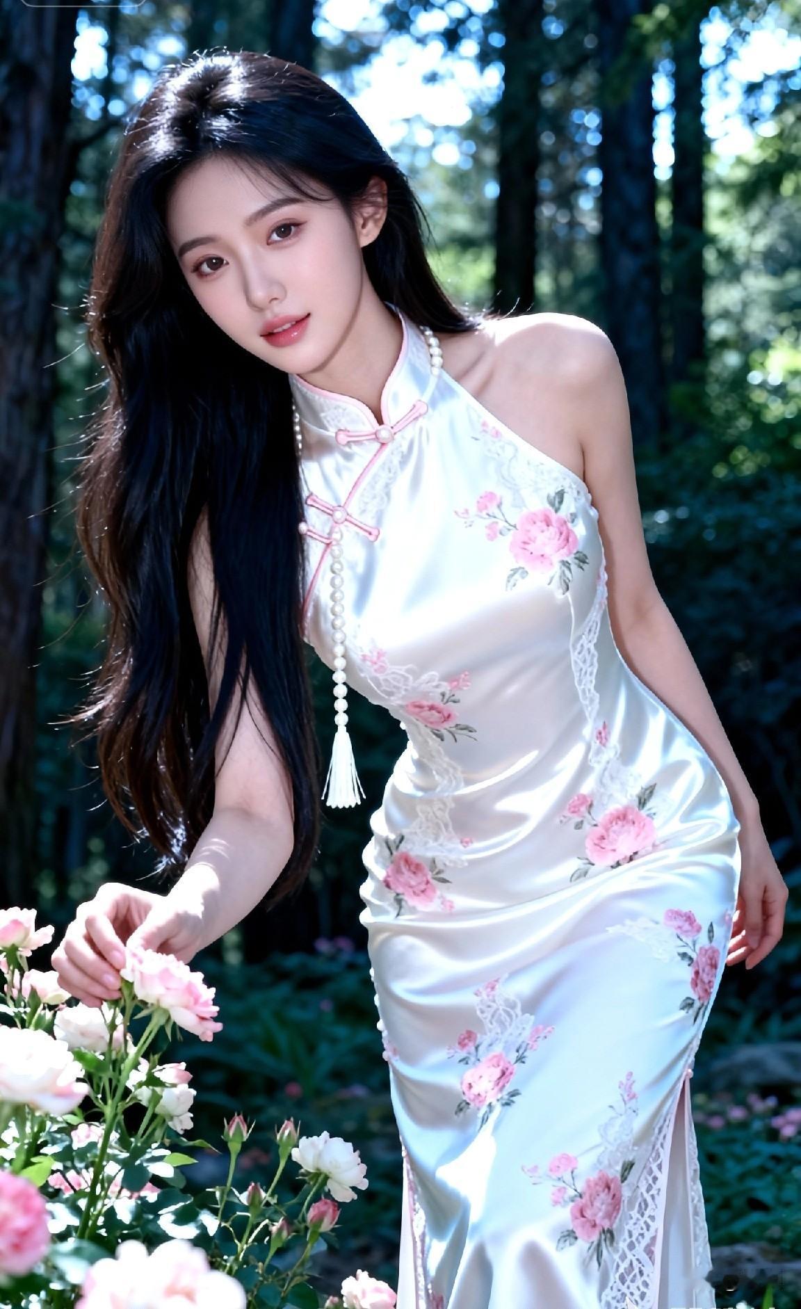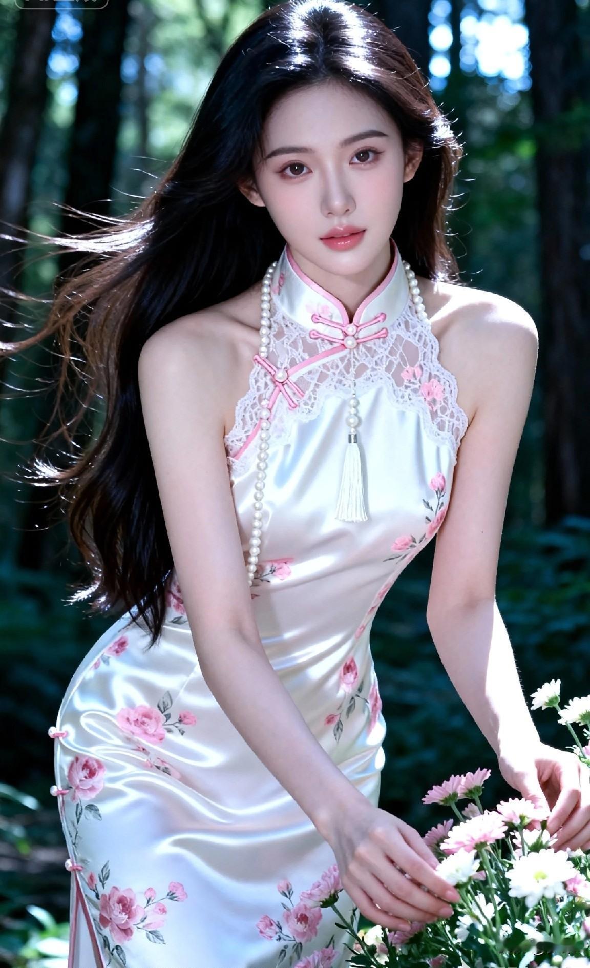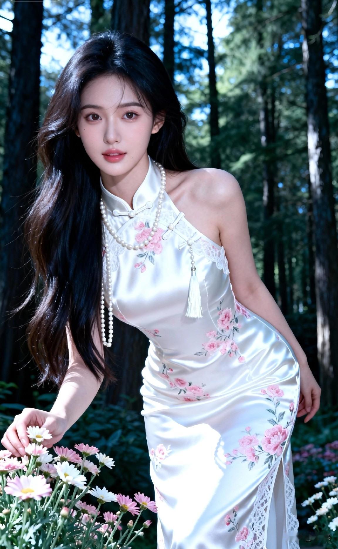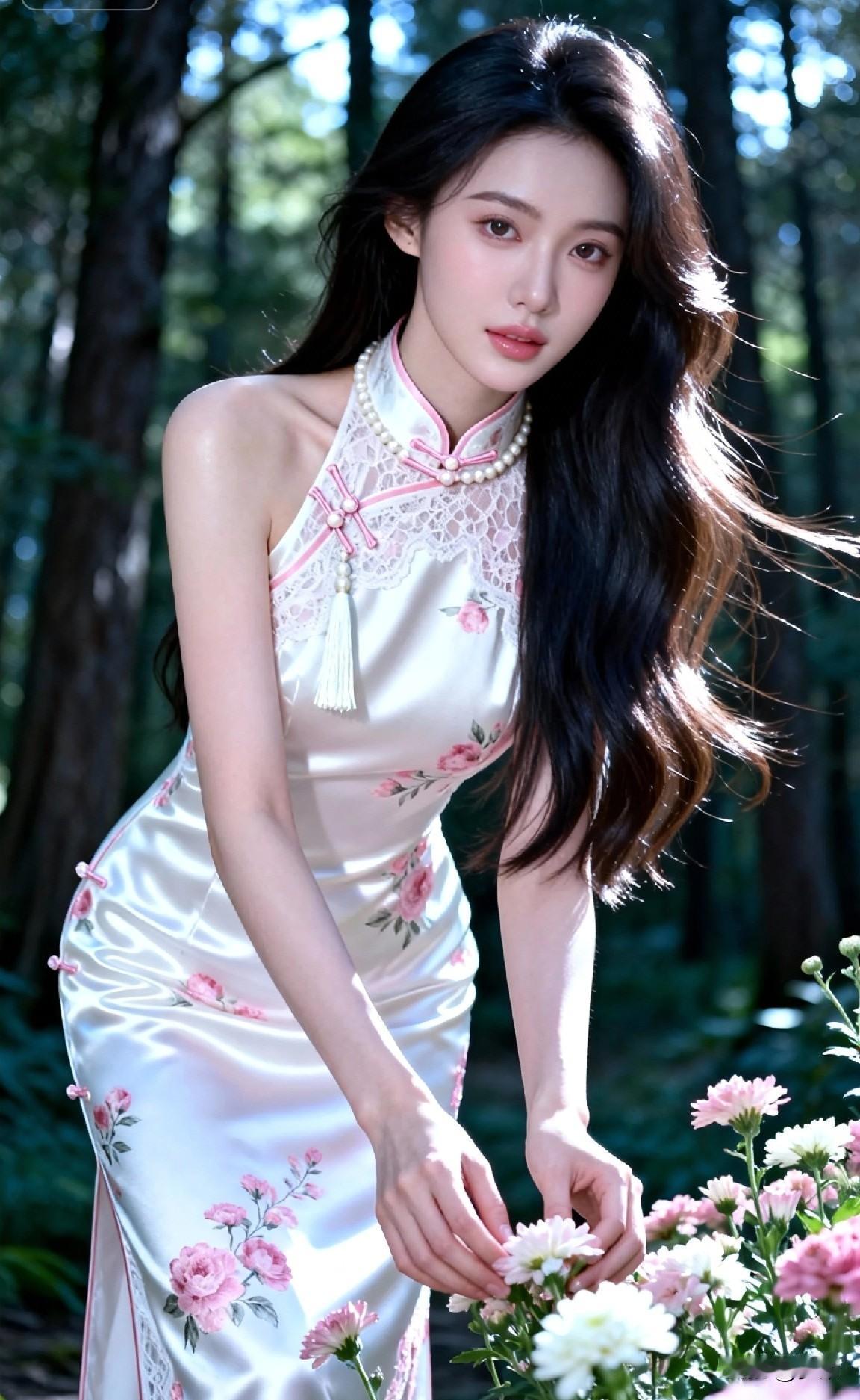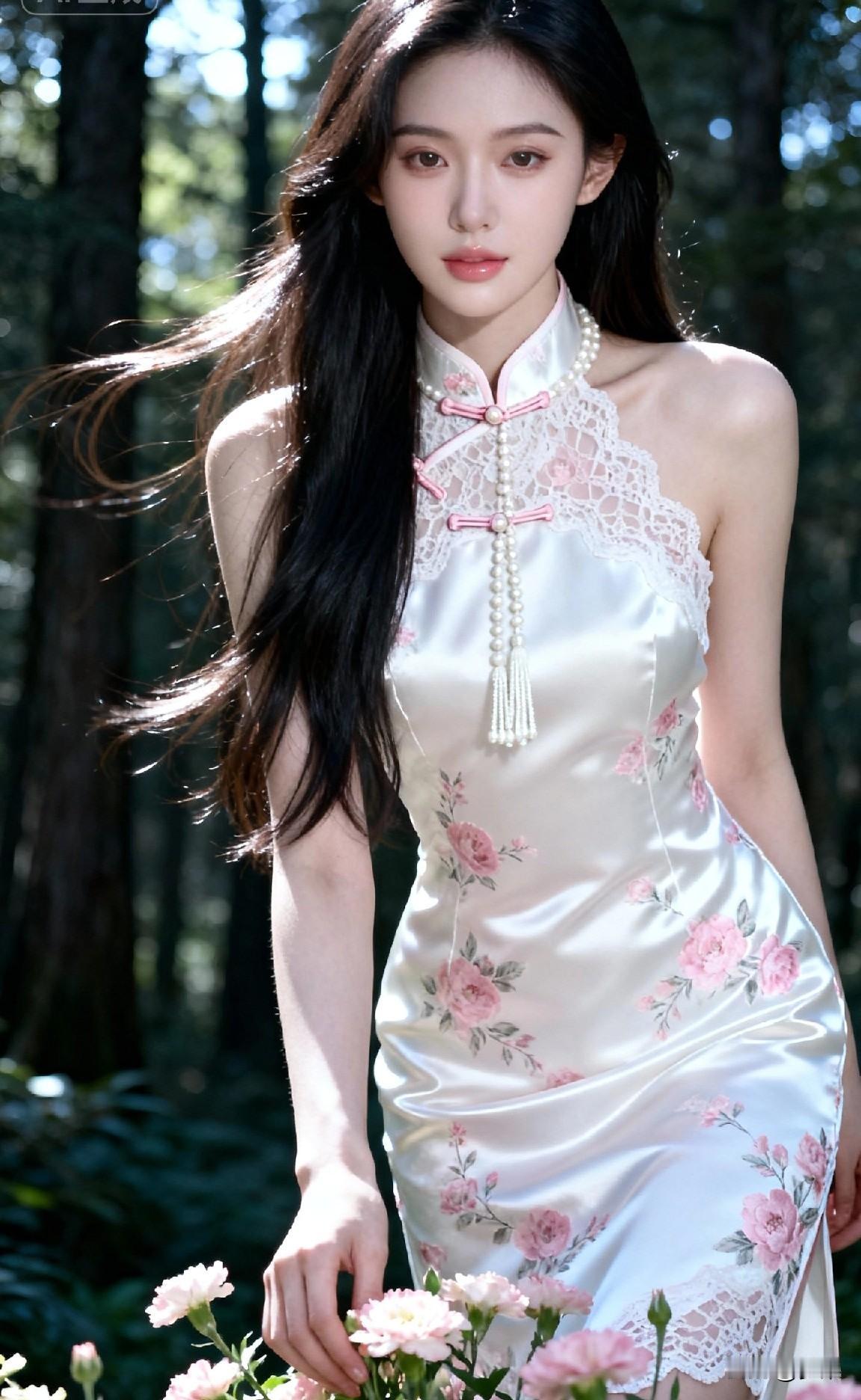 太美了!她穿着旗袍在森林里赏花江南美女旗袍 旗袍风景 绿花旗袍少女 户外景点旗袍