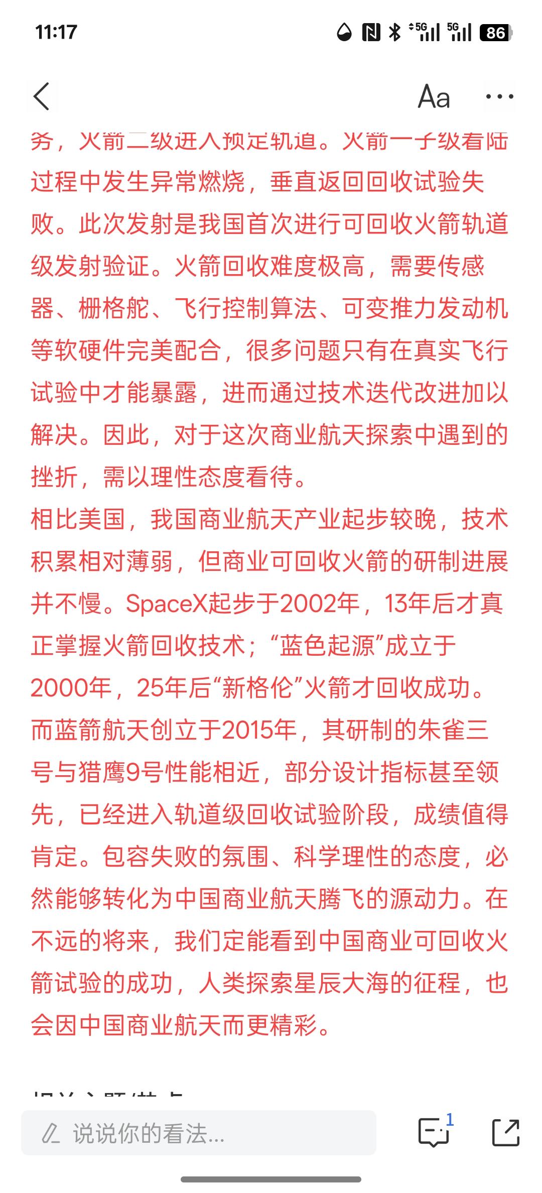 科技日报:理性看待商业航天探索中遇到的挫折,中国在商业航天探索的领域比欧美国家起步较晚,其实这一次虽然没有回收成功,但也是我们在商业航天领域迈出的第一步,失败这个东西在很完美,只有不断的试错与失败,才能掌握真正的核心技术!其实,中国的科技与经济发展算得上是世界上的一个奇迹!中国从一个农耕时代变为了一个科技强国,只用短短的不到100年时间!其实,中国在航天,航空领域以及科技创新领域,这些年的技术性突破远超于其他国家!在航空航天领域,中国取得了非常巨大的成功!