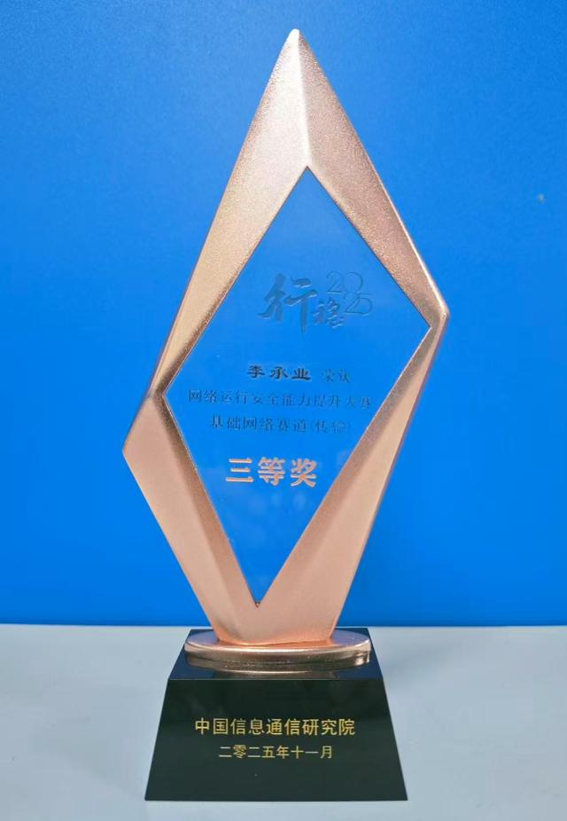 本次大赛由中国信息通信研究院主办,以“网络安全重于泰山,携手并肩行稳致远”为主题,吸引了全国基础电信企业的技术精英同台竞技。李承业长期深耕传输网络领域,专注于OTN/SDH传输网络架构优化、设备运维及安全防护等工作,曾牵头完成多项区域传输网络升级改造任务。在日常工作中,他积极探索技术创新,将AI技术融入运维流程,构建起“智能预警-快速响应-闭环复盘”的防护机制,有力保障了重大活动与极端天气下的网络稳定运行。