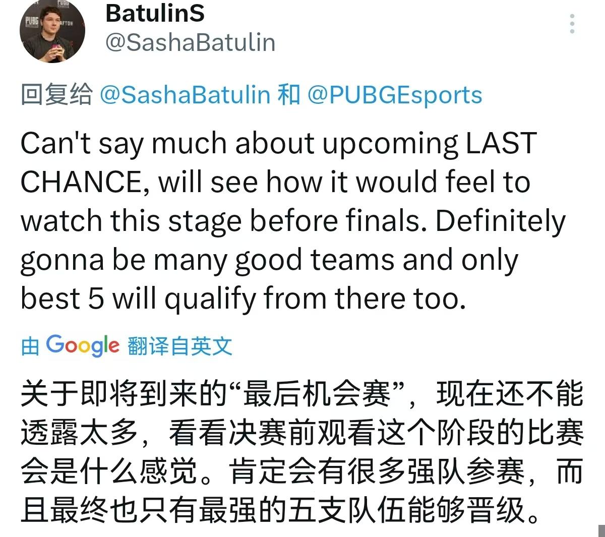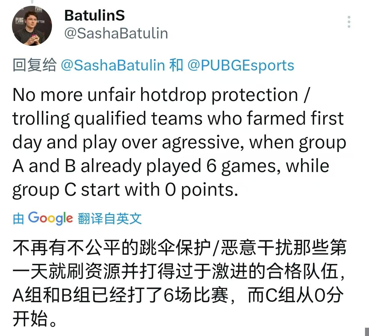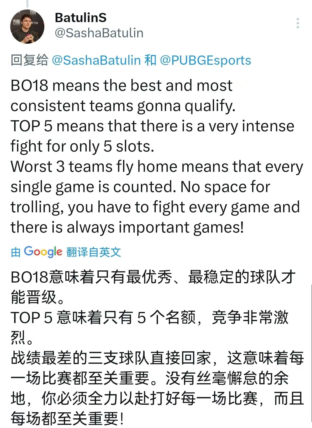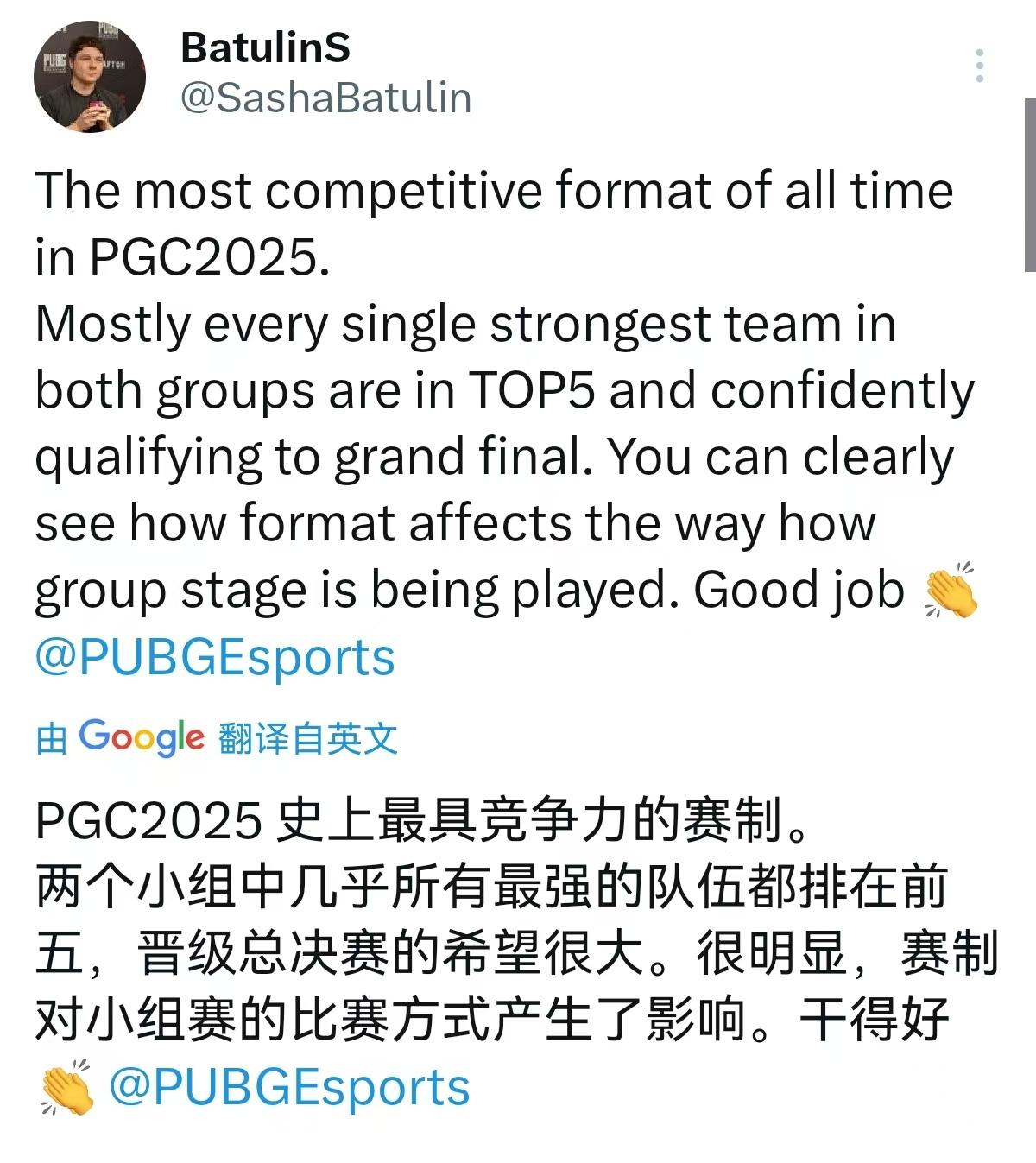Batulins:PGC2025史上最具竞争力的赛制,两个小组中几乎所有最强的队伍都排在前五,晋级总决赛的希望很大。很明显,赛制对小组赛的比赛方式产生了影响。干得好!BO18意味着只有最优秀、最稳定的战队才能晋级。不再有不公平的跳伞保护/恶意干扰那些第一天就刷资源并打得过于激进的合格队伍,A组和B组已经打了6场比赛,而最后机会组从0分开始。关于即将到来的“最后机会赛”现在还不能透露太多,看看决赛前观看这个阶段的比赛会是什么感觉。肯定会有很多强队参赛,而且最终也只有最强的五支队伍能够晋级。