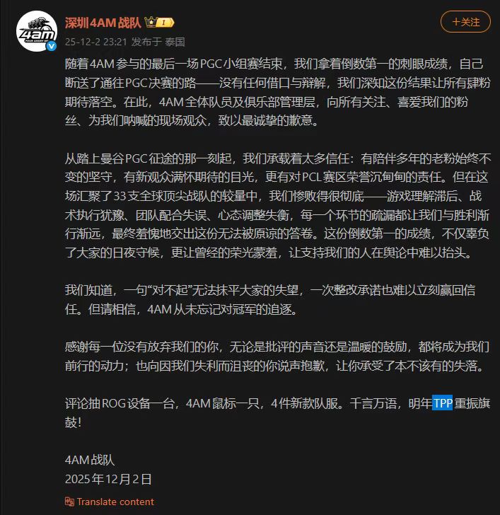 4AM:随着4AM参与的最后一场PGC小组赛结束,我们拿着倒数第一的刺眼成绩,自己断送了通往PGC决赛的路--没有任何借口与辩解,我们深知这份结果让所有肆粉期待落空。在此,4AM全体队员及俱乐部管理层,向所有关注、喜爱我们的粉丝、为我们呐喊的现场观众,致以最诚挚的歉意。