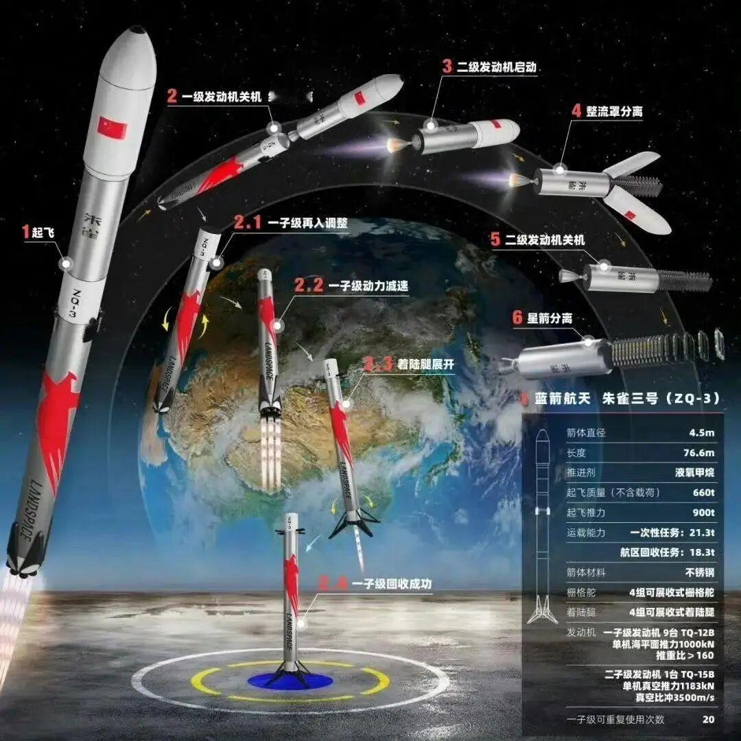 从朱雀二号遥一(2022)到朱雀三号遥一(2025) ​​​​ 2023年7月12日,蓝箭的朱雀二号成功入轨,成为全球第一枚用甲烷燃料到达轨道的火箭——比SpaceX和蓝色起源还早。 2025年12月3日中午,中国西北戈壁深处,一枚高66米的不锈钢火箭腾空而起,直刺苍穹。 在一级火箭返回着陆阶段,5台反推发动机点火后,有部分发动机突发异常燃烧,导致助推器未能完成圆满软着陆,最终在回收场坪边缘落地。 尽管如此,这场“入轨成功、回收未遂”的首飞任务,仍被业内普遍评价为“部分成功”——因为火箭不仅完成了核心轨道发射目标,更在极端条件下实现了极高的返回精度。 这是中国首家商业航天公司蓝箭航天自主研发的朱雀三号运载火箭首箭,也是中国首枚面向轨道发射任务、同时验证一级垂直回收的可重复使用液体火箭。 这一步,虽未登顶,却已跨越门槛。中国商业航天,正式迈入“可重复使用时代”的实战验证阶段。 蓝箭已经入选了中国载人航天工程办公室的商业货运项目,计划从2026年开始为天宫空间站运送货物。 这意味着民营火箭公司正在从边缘走向主流,开始承担起原本只有国家队才能干的活儿。 加油,蓝箭!